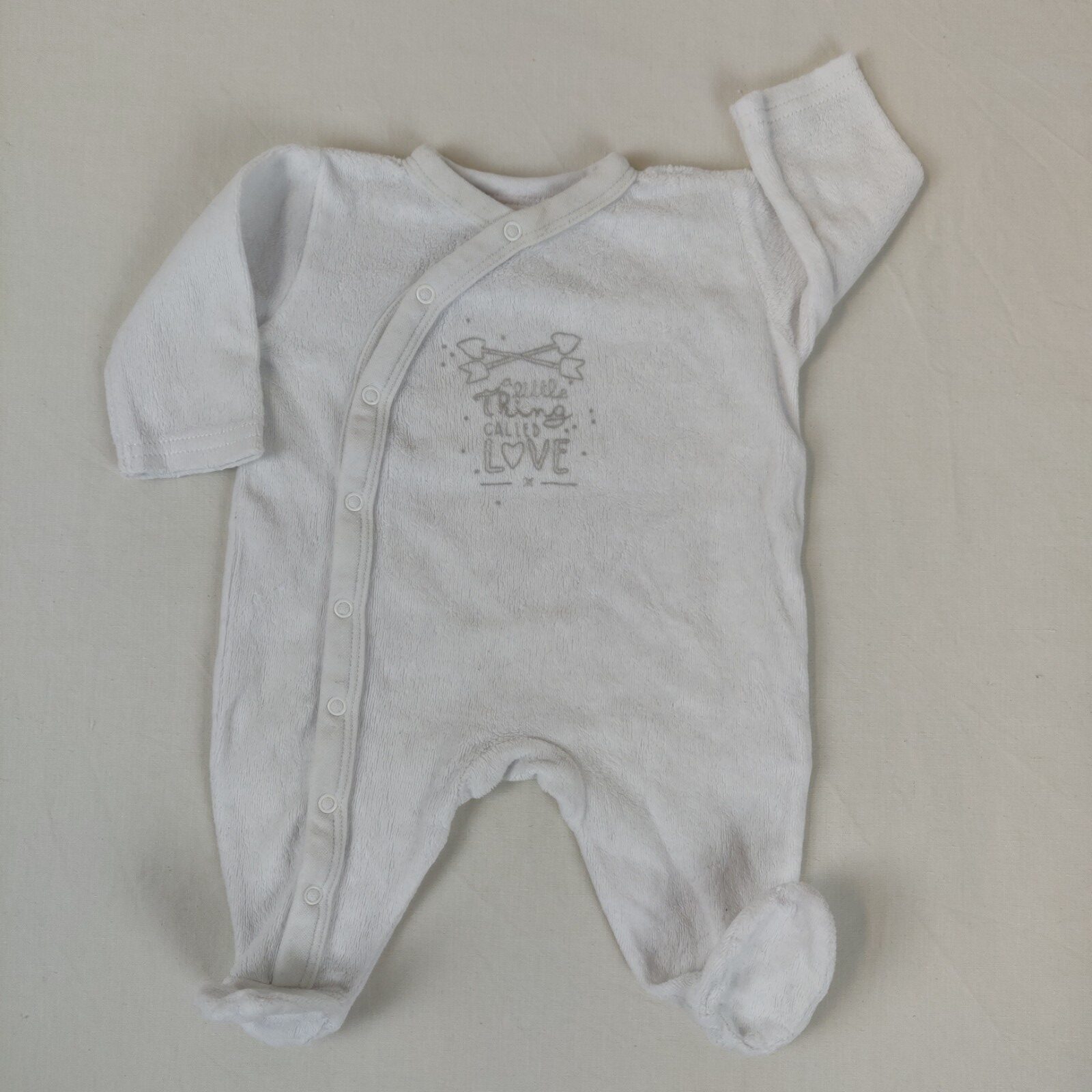 Autres commentaires : 20% polyester. Pyjama 1 pièce DORS-BIEN à manches longues et à pieds. Inscription centrale grise « A little thing called love ». Ouverture pressionnée au devant. Légère tâche discrète maronnée au niveau du col.