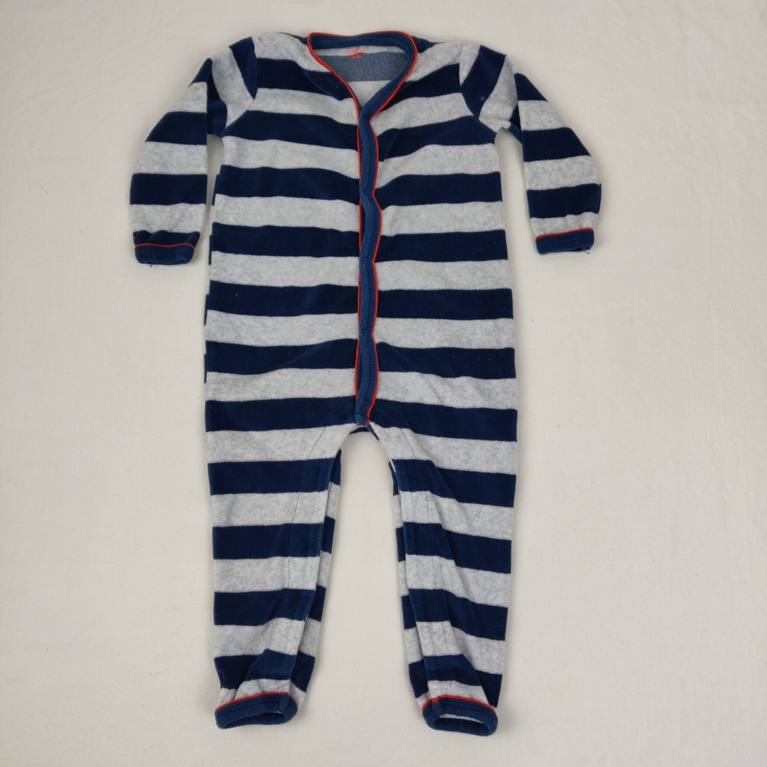 Autres commentaires : Pyjamas gris velours à rayures bleues sans pieds, fermeture par boutons pression à l’avant