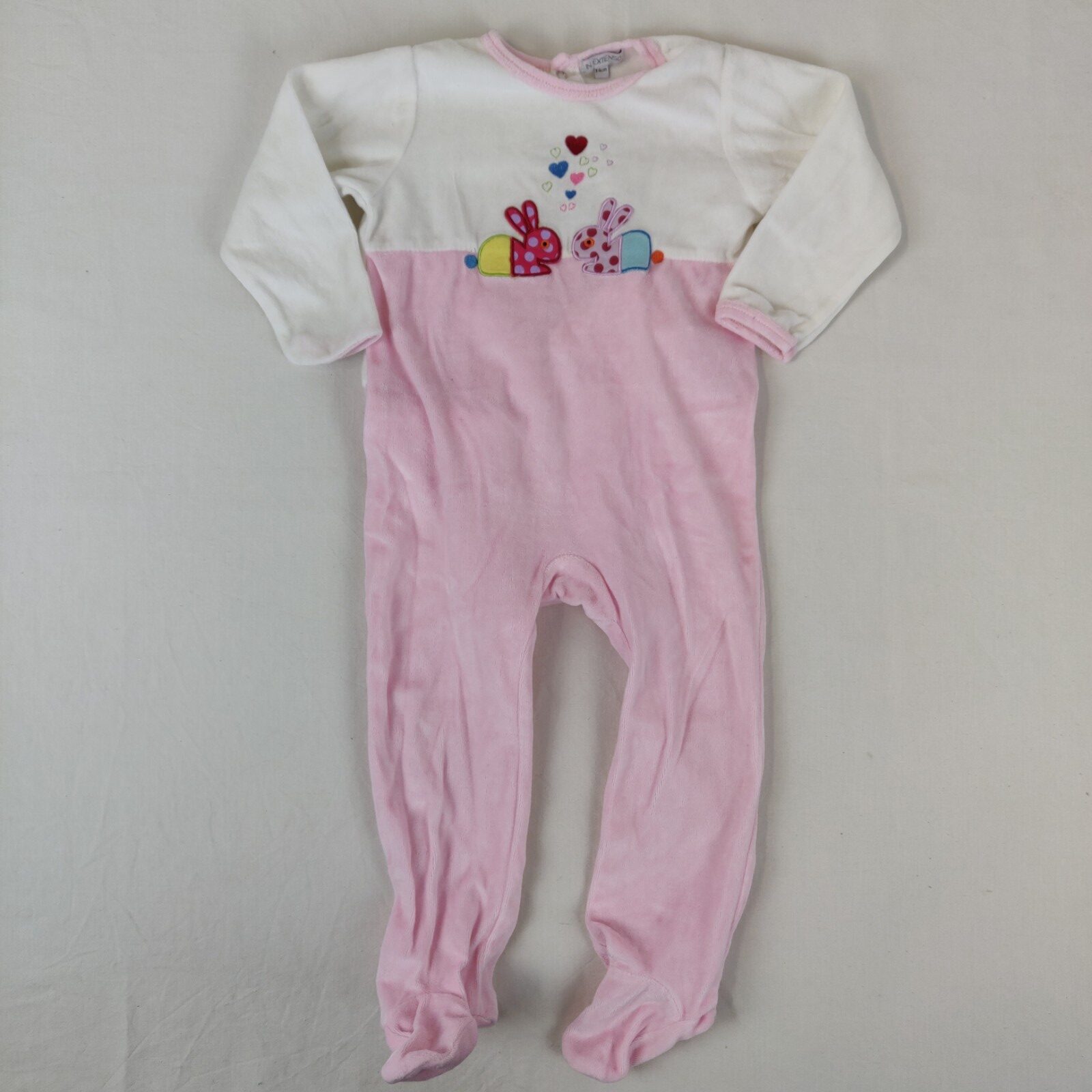 Autres commentaires : 20% polyester. Pyjama 1 pièce DORS-BIEN à manches longues et à pieds en velours bicolore rose et blanc. Motifs centraux deux petits lapins. Ouverture pressionnée au dos.