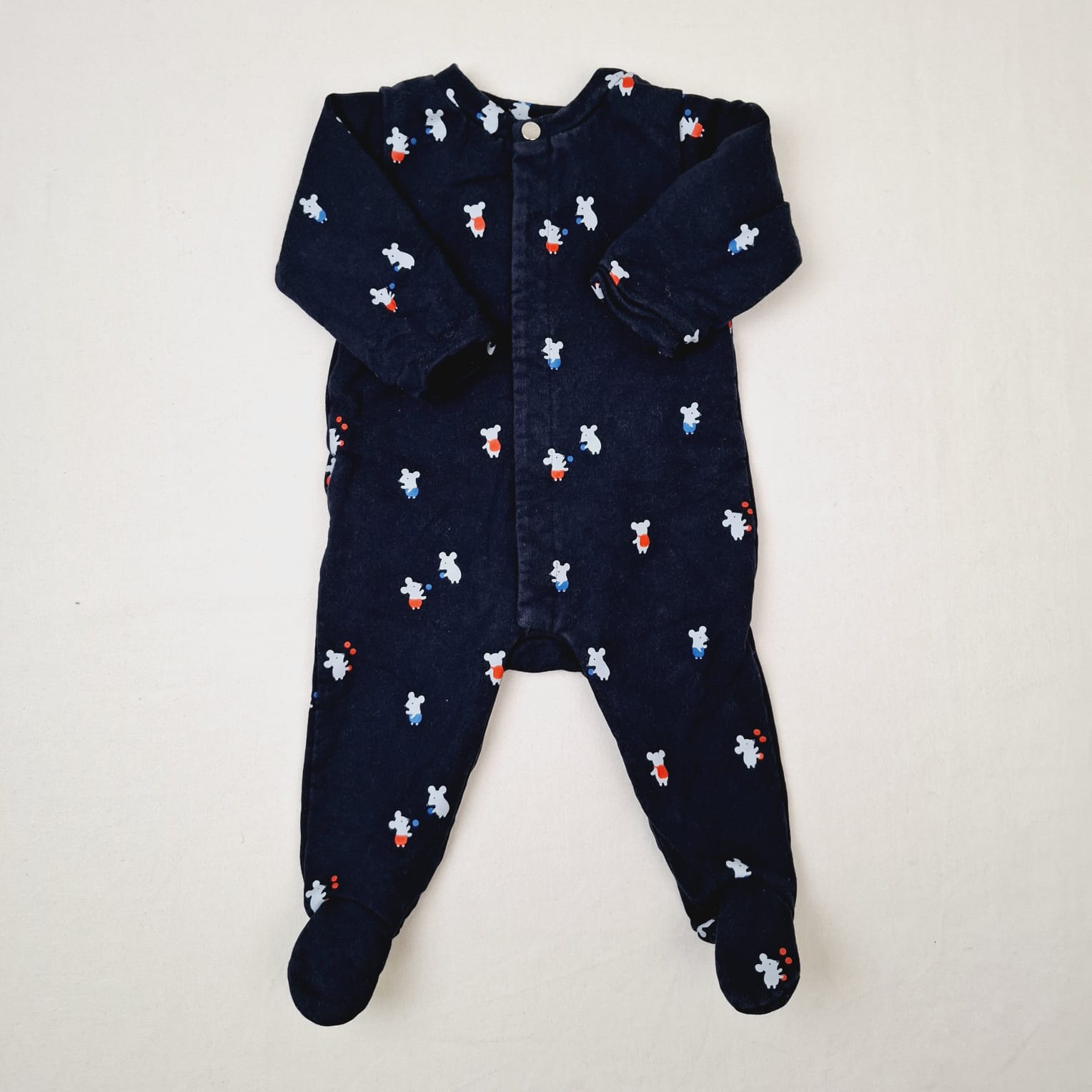 Autres commentaires : Pyjama en molleton marine, motif serises, col rond, fermeture boutonnée cachée devant et à l’entrejambe.