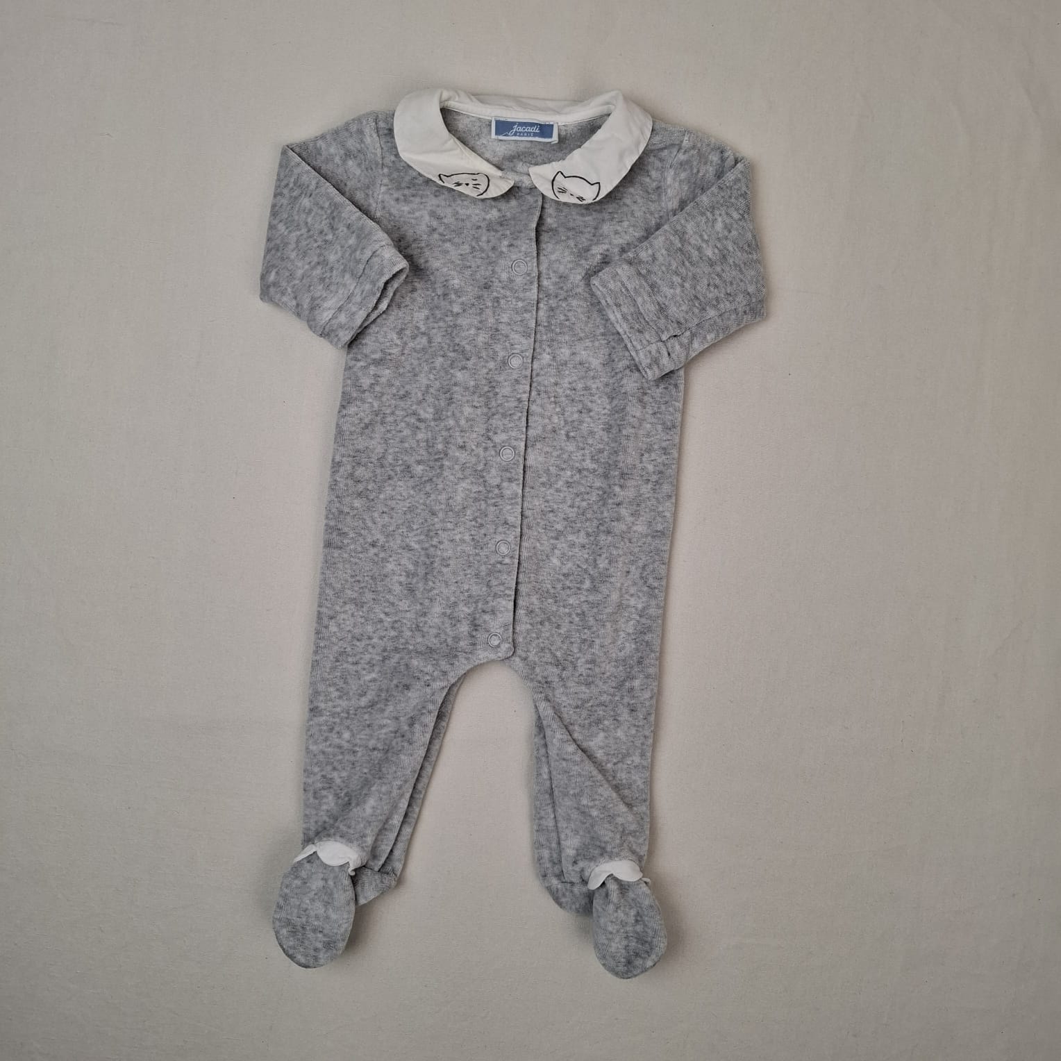Autres commentaires : Pyjama dors-bien en velours gris, col claudine en tissu blanc avec tête de chat brodée, rappel de tissu blanc, fermeture devant et à l’entrejambe par boutons pression, élastiqué au dos.