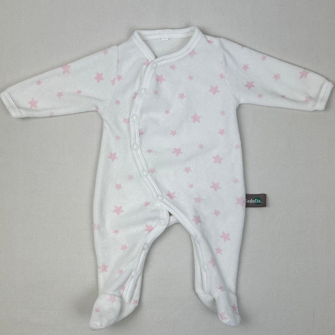 Autres commentaires : Pyjama 1 pièces Kadolis blanc avec des étoiles roses, manches longues, fermeture par boutons pression.