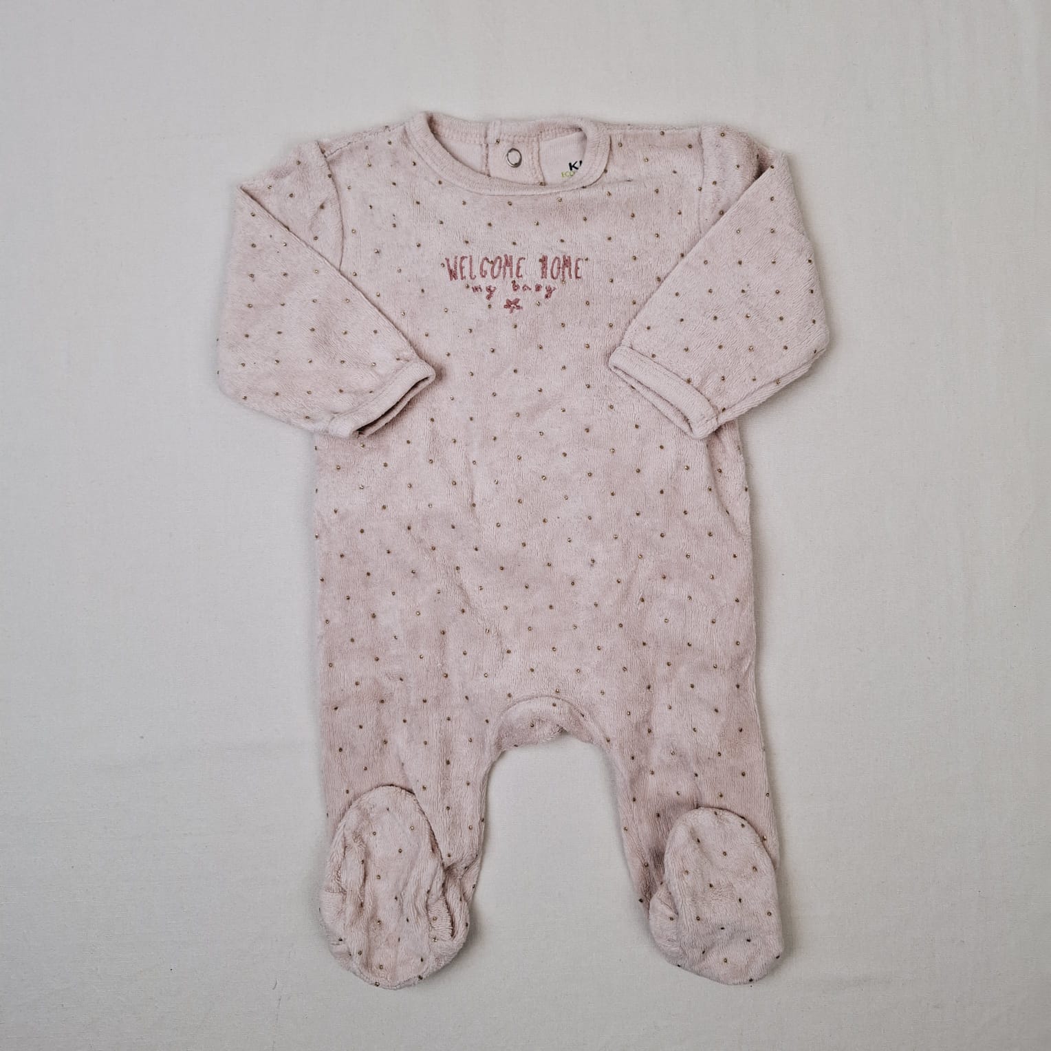 Autres commentaires : 23% polyester. Pyjama en velours rose à pois dorés à manches longues, col rond, fermeture par boutons pression au dos, inscription « Welcome home ».