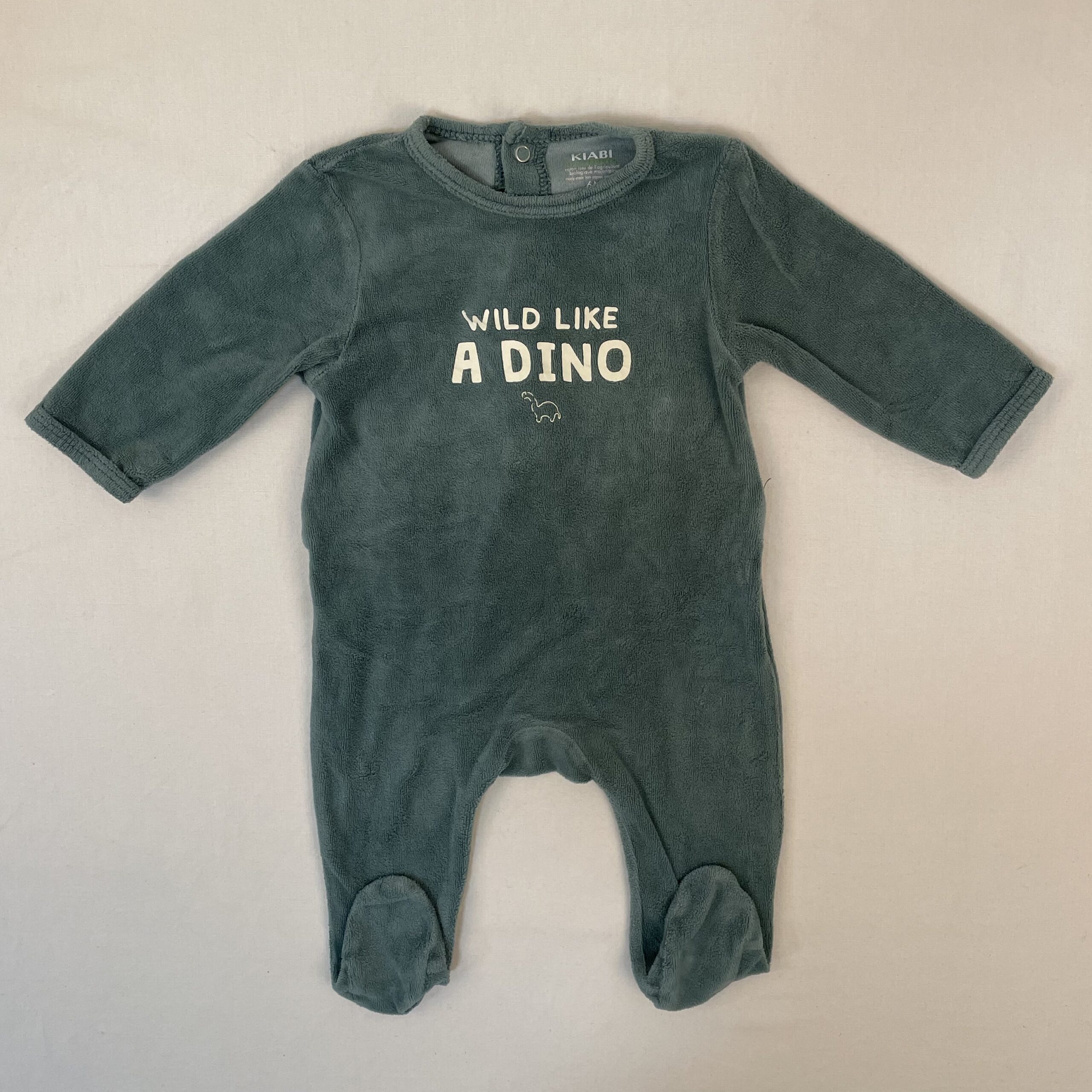 - Pyjama dors-bien en velours bleu-vert, devant inscription en blanc « Wild like a dino ». Gamme Eco conception en coton organisque