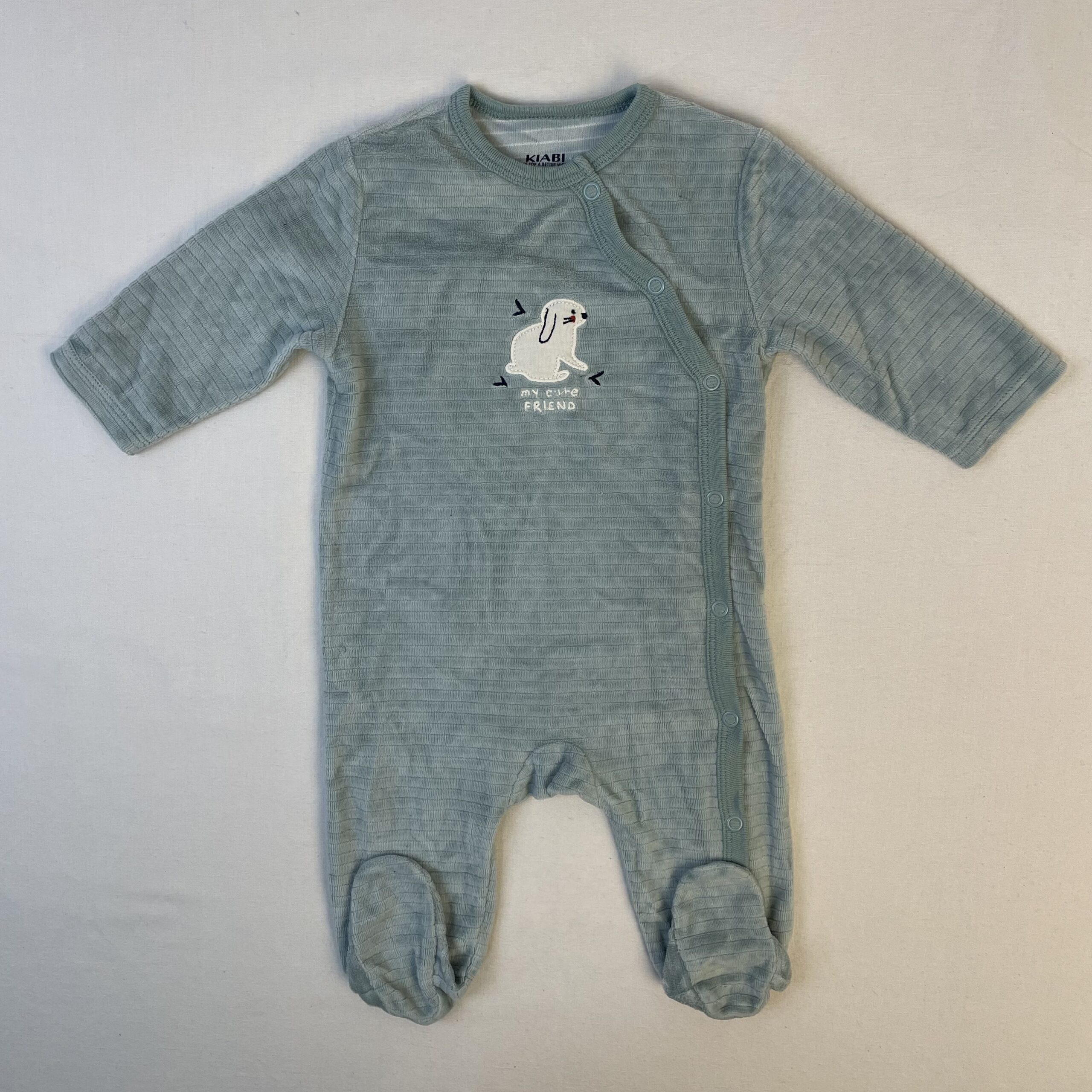 - Pyjama vert clair doux avec avec pieds et un lapin brodé au centre. Ouverture via des boutons de pressions