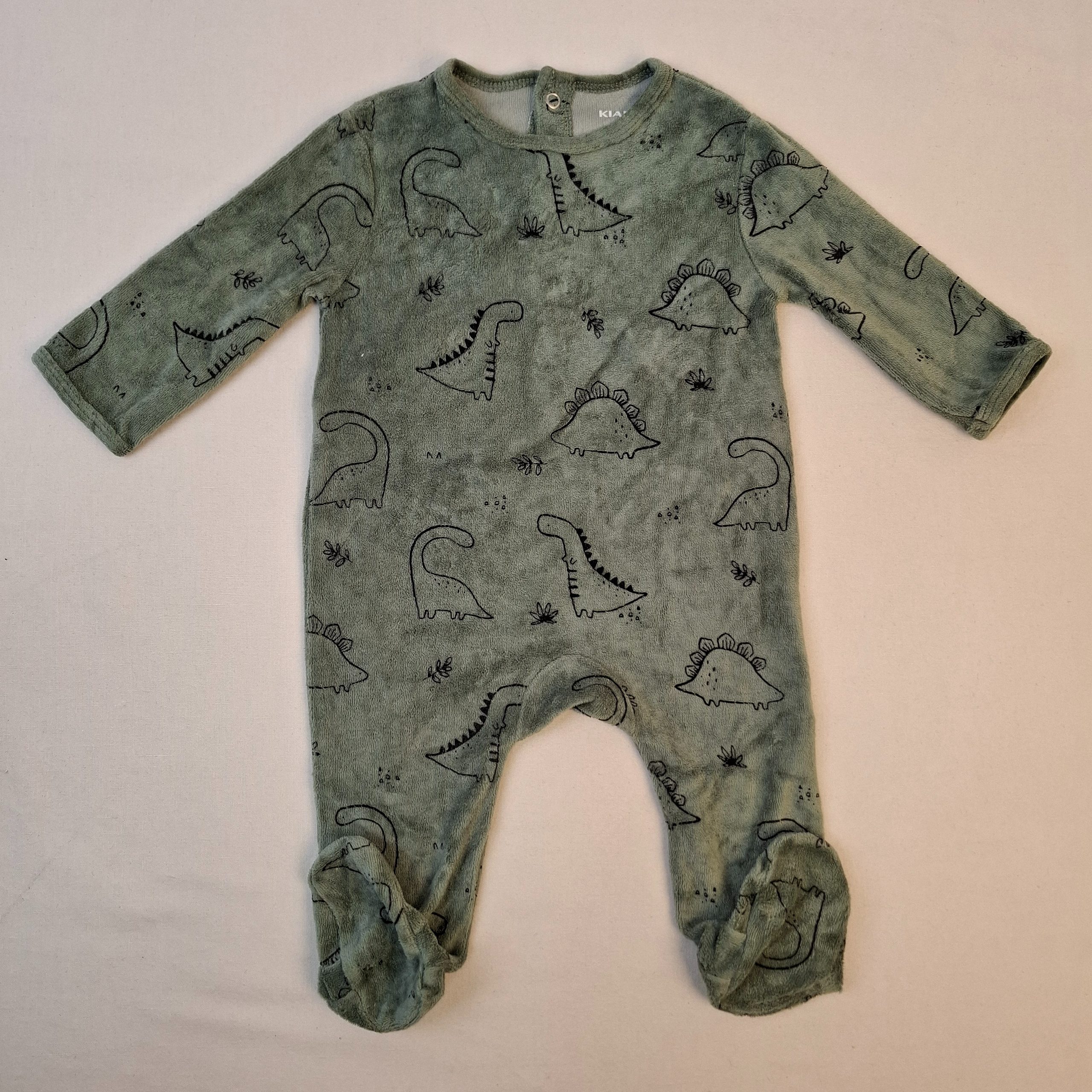 - Pyjama dors-bien en velours vert, parsemé de dinosaures, fermeture au dos par boutons pression.