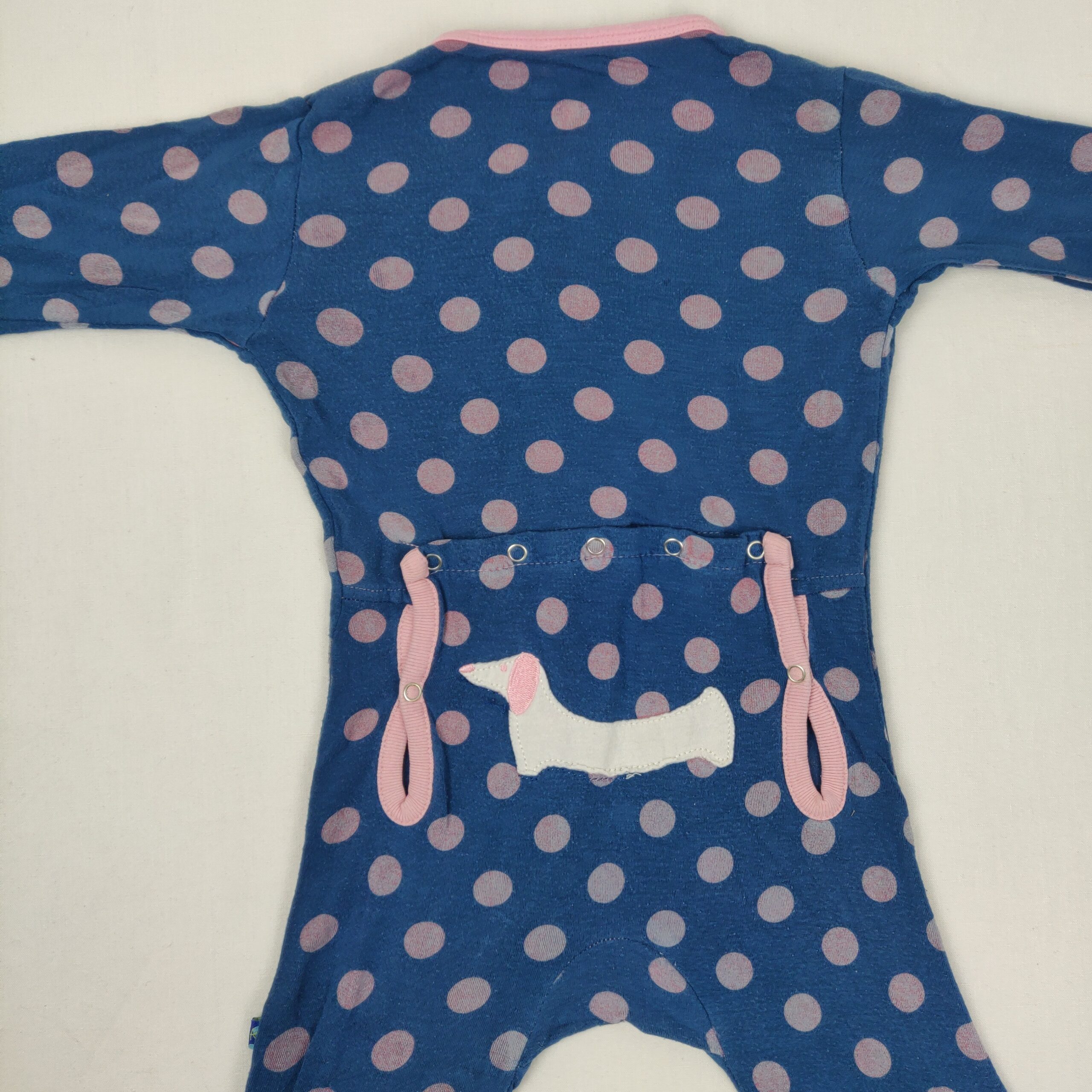 Autres commentaires : 95 % viscose et 5 % lycra, Pyjama bleu roi à pois chiné gris, encolure et bordures bras et jambe rose, état d’usage bouloché
