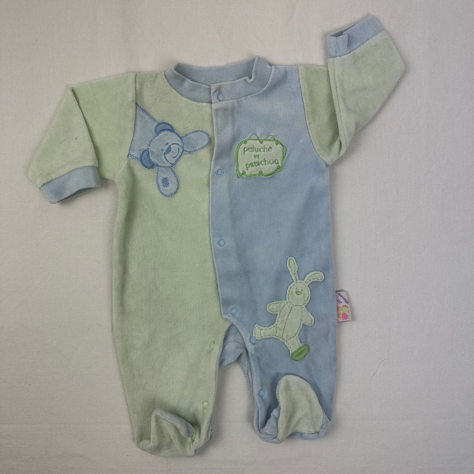 Autres commentaires : Pyjama une piéce 2 tons bleu et vert avec une fermeture devant par boutons pressions et au niveau des jambes.