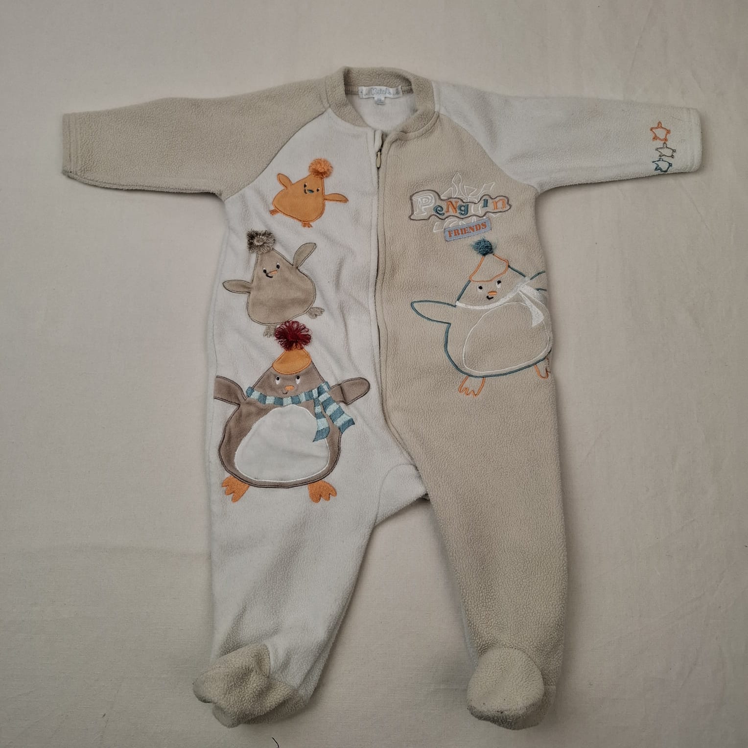 Autres commentaires : Pyjama en polaire beige, motif les pingouin et inscription « penguin friends », fermeture par zip devant, col rond.