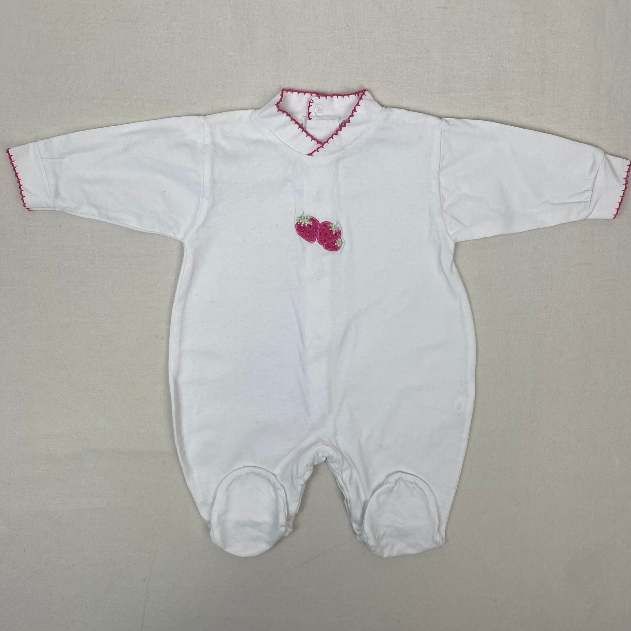 Autres commentaires : Pyjama blanc Linvosges, motif fraises brodées sur le haut du corps, col cache coeur, fermeture par boutons pression dans le dos.