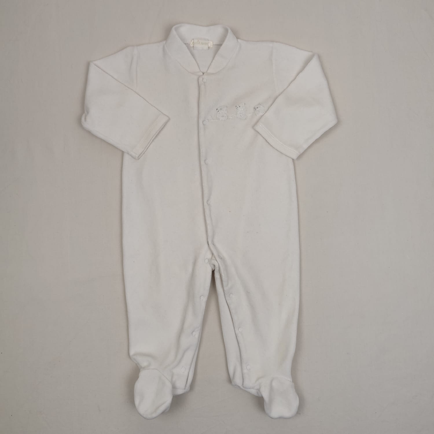 Autres commentaires : Pyjama dors-bien en velours blanc, avec pieds, motif mini souris blanches en relief au niveau de la poitrine, fermeture par boutons pression devant. Petit défaut : trace jaune sur le pied gauche. Niiveau réduit de Kiwi à Fraise.