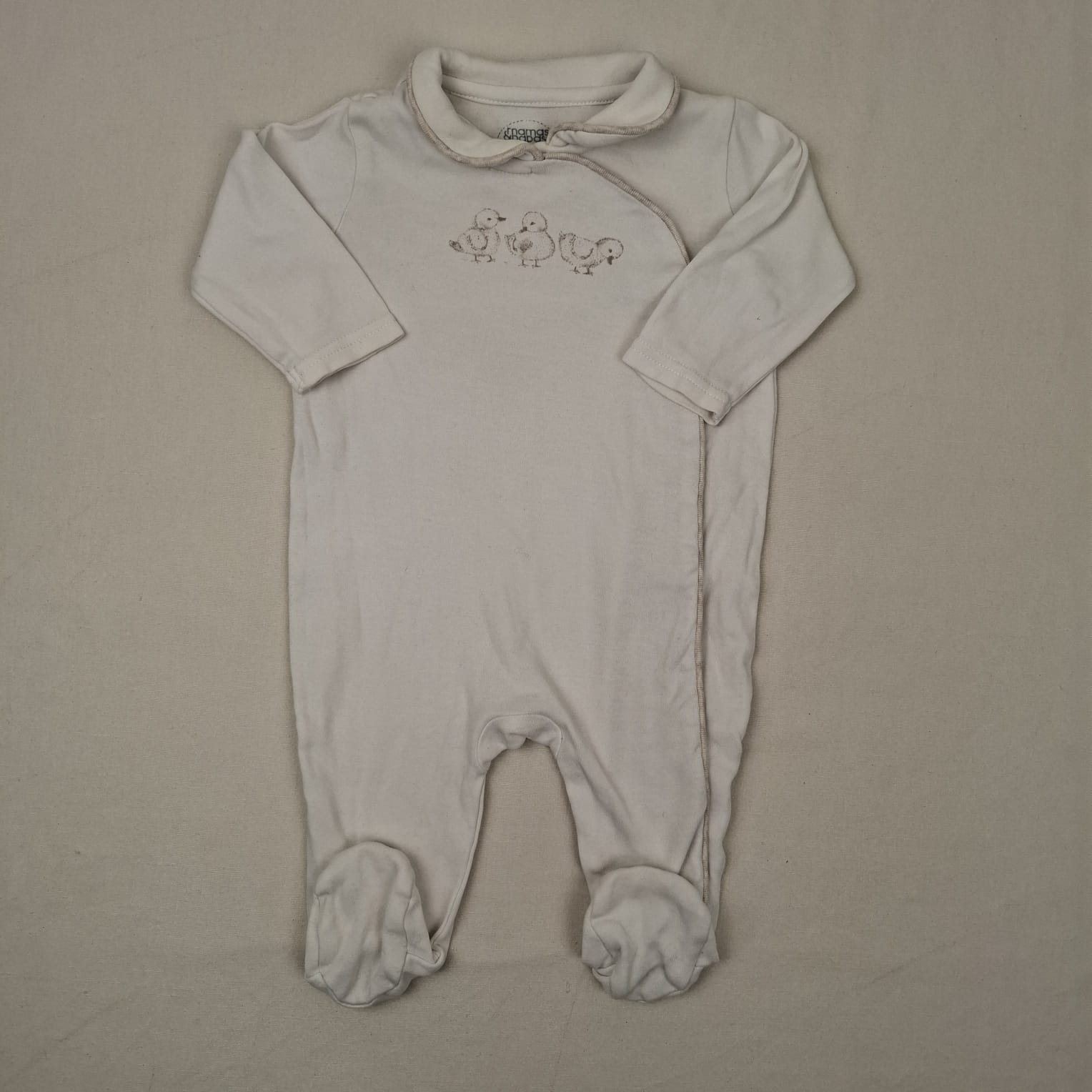 Autres commentaires : Pyjama blanc uni, col Claudine, motif caneton, fermeture par boutons pression.
