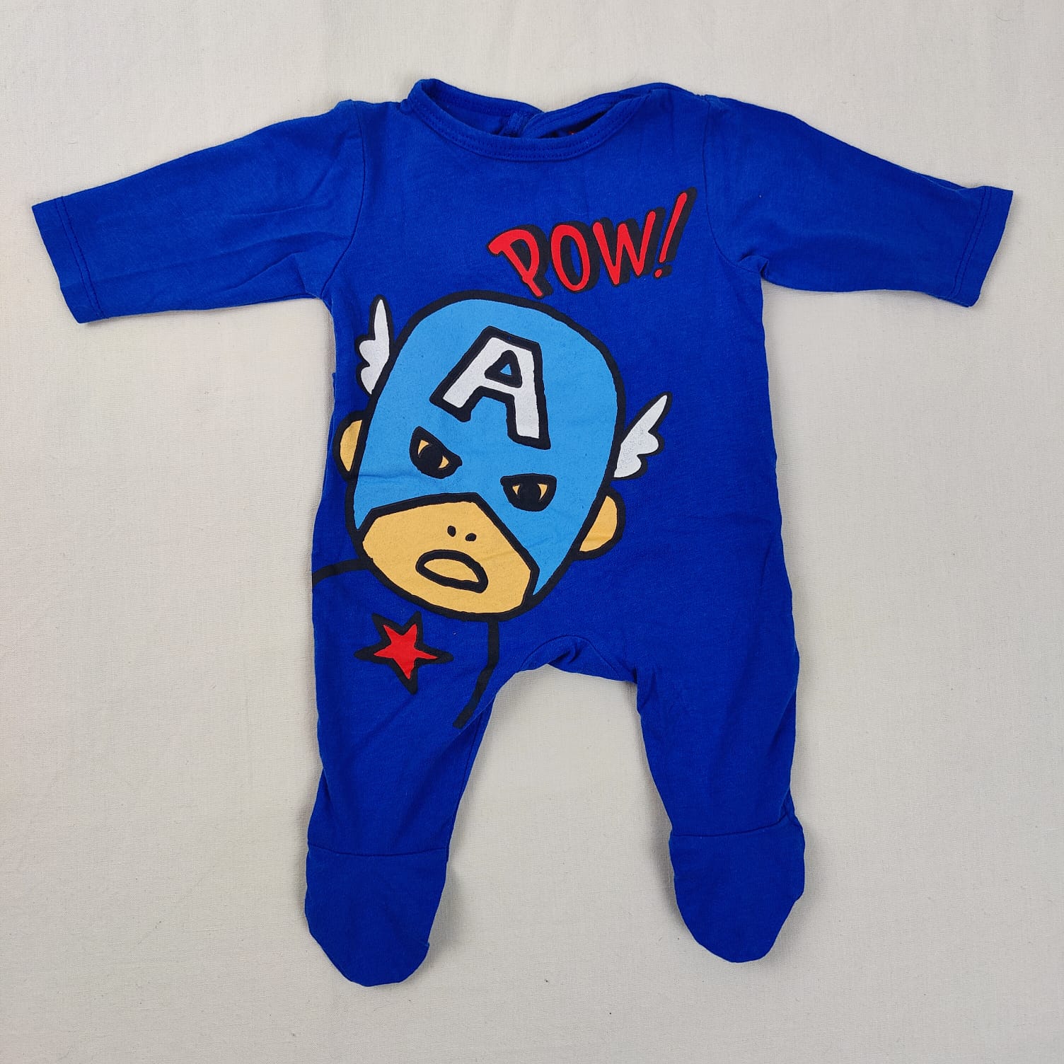 Autres commentaires : Pyjama dors bien en jersey bleu avec pieds, imprimé Captain America, ouverture pressionnée au dos