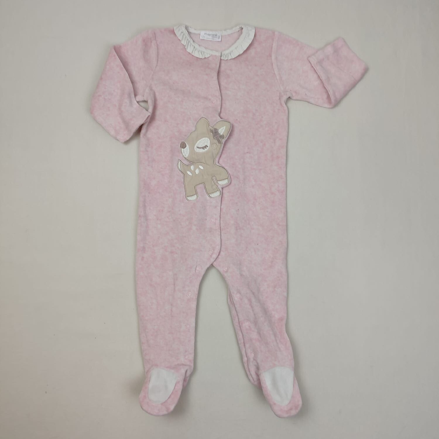 Autres commentaires : 20% polyester. Pyjama Dors-bien rose, motif faon sur le devant, fermeture par boutons pression à l’avant et à l’entrejambe, col colerette.