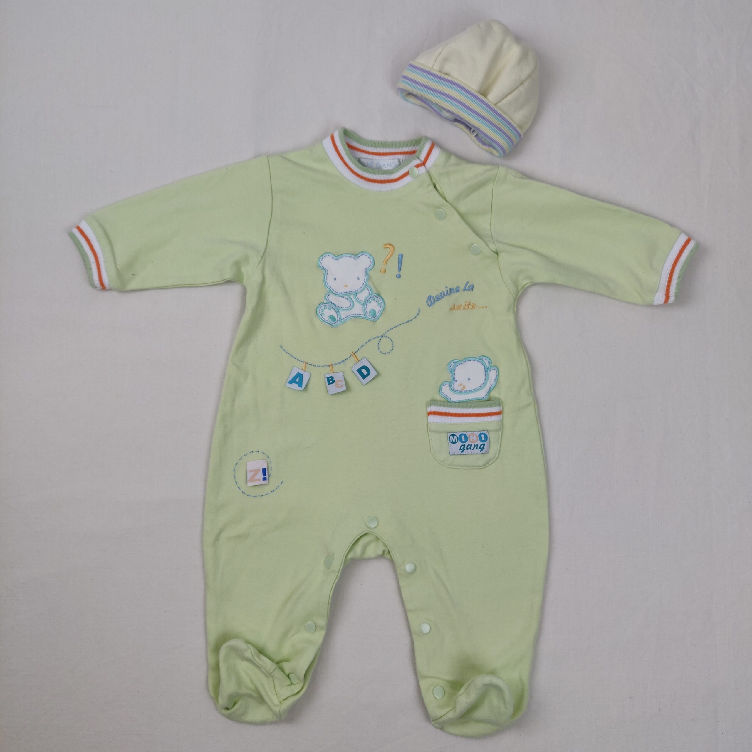 Autres commentaires : Bonnet vert, rayé en bas, pyjama Mini Gang vert ours brodé avec pieds