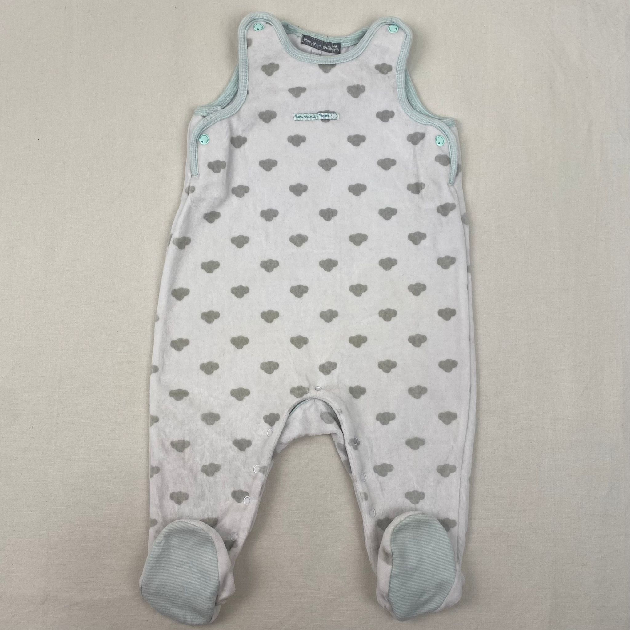 Autres commentaires : 23% polyester. pyjama sans manche en velour blanc avec petits nuages gris et bordure en vert menthe pale bretelle a bouton pression