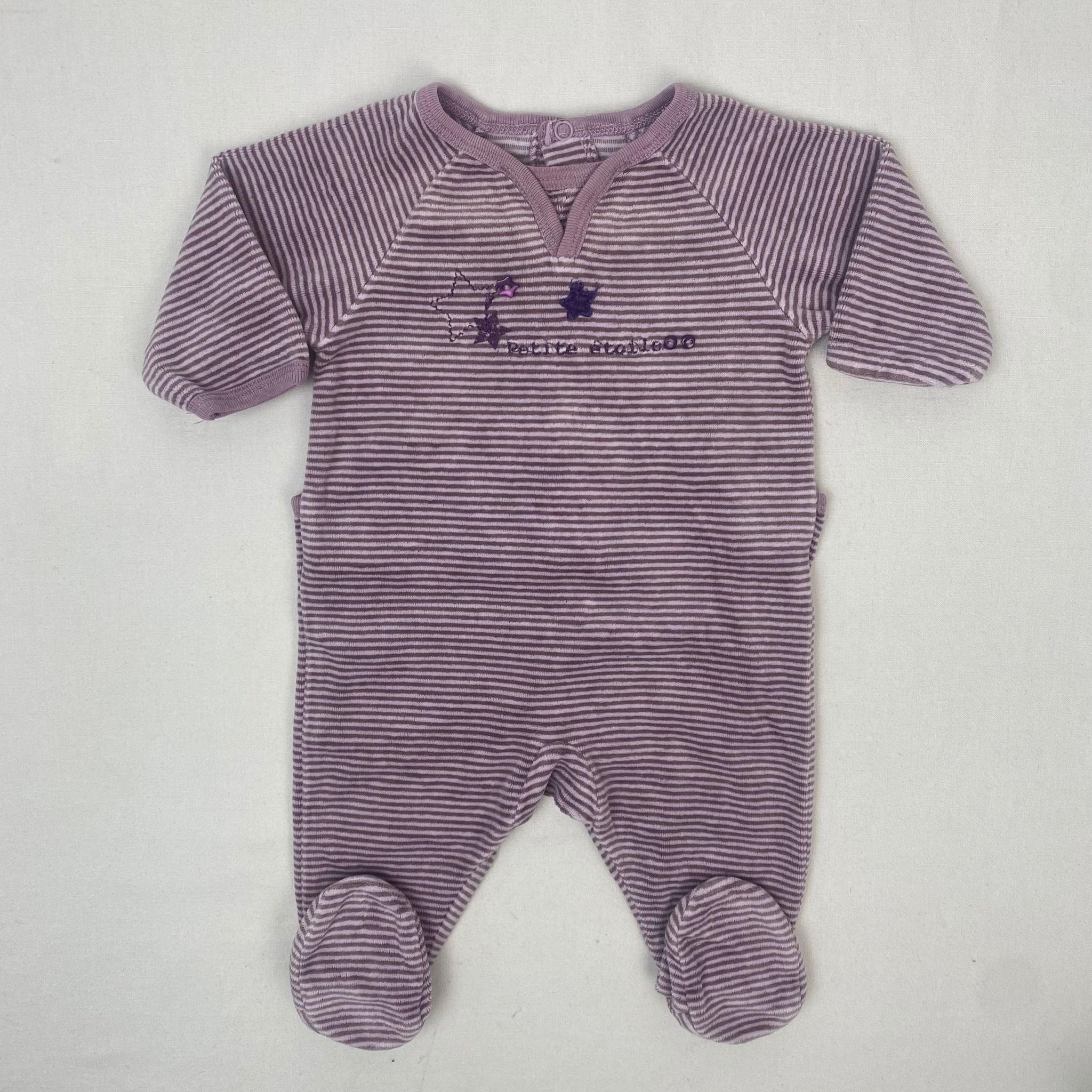 Autres commentaires : 23% polyester. Pyjama dors-bien violet manches longues, fermeture par boutons de pression au dos, motifs étoiles avec inscription « petite étoile ».