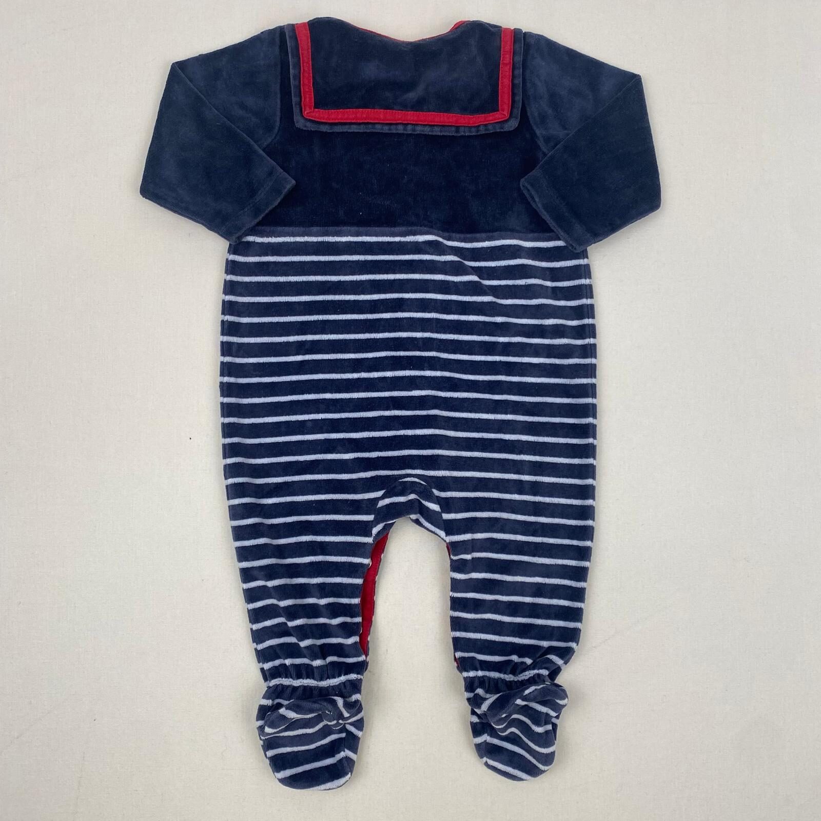 Autres commentaires : 23% polyester. Pyjama en velours bleu gris foncé, bas à rayures blanches, col rond, fermeture par boutons pression devant et à l’entrejambe.