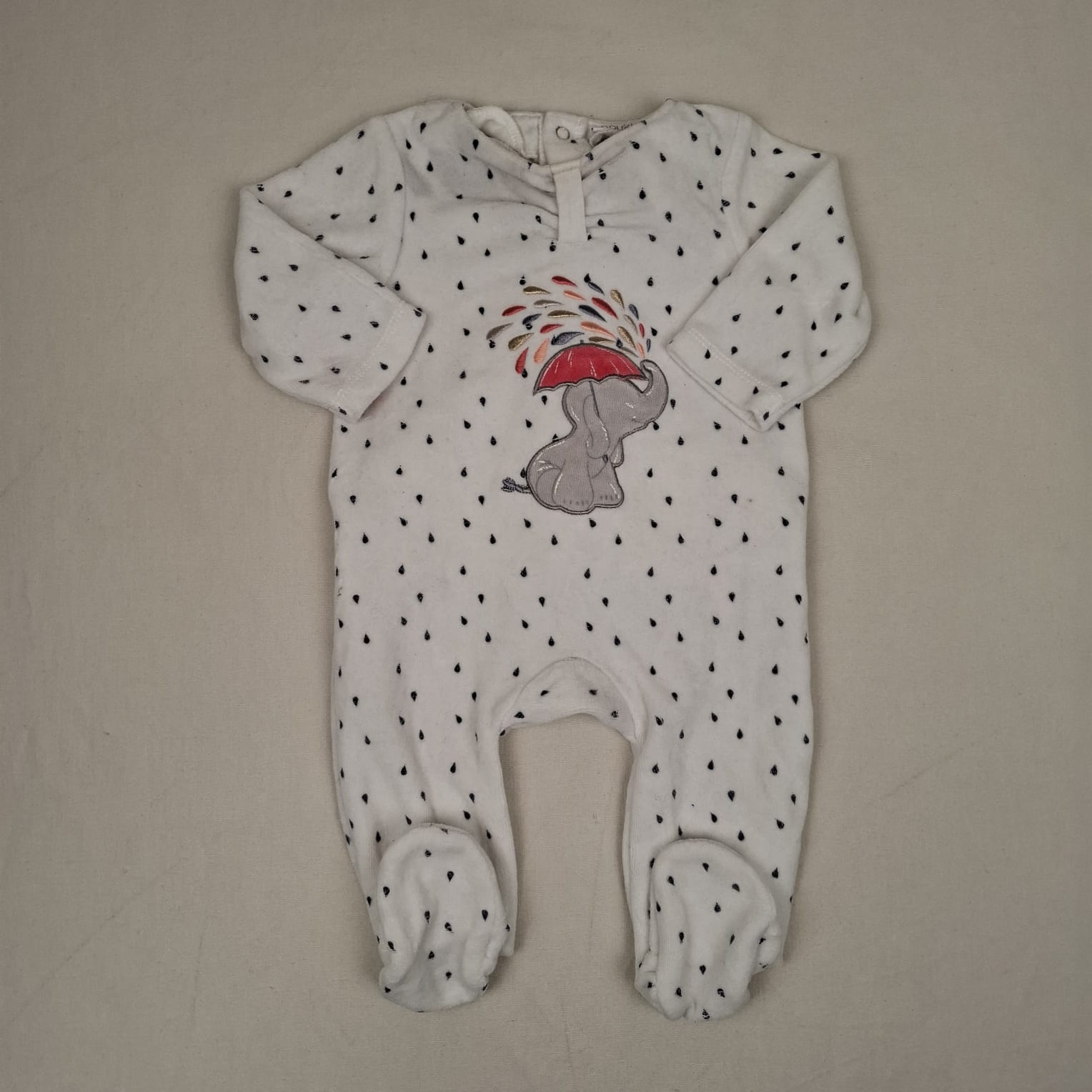 Autres commentaires : 30% polyester. Pyjama dors-bien en velours blanc, parsemé de goutelettes gris argenté, grosse fleur grise au niveau du postérieur, devant motif éléphanteau gris avec parapluie saumon en train de s’arroser avec des goutelettes orange, dorées et grise, fermeture au dos par boutons pression, chevilles élastiquées.