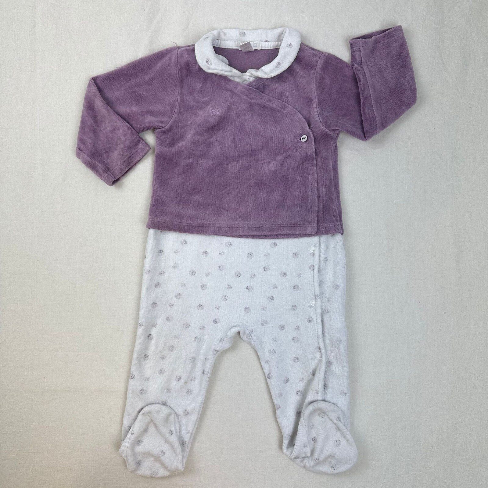 Autres commentaires : Pyjamas une piéce violet, col claudine et une fermeture devant par boutons.