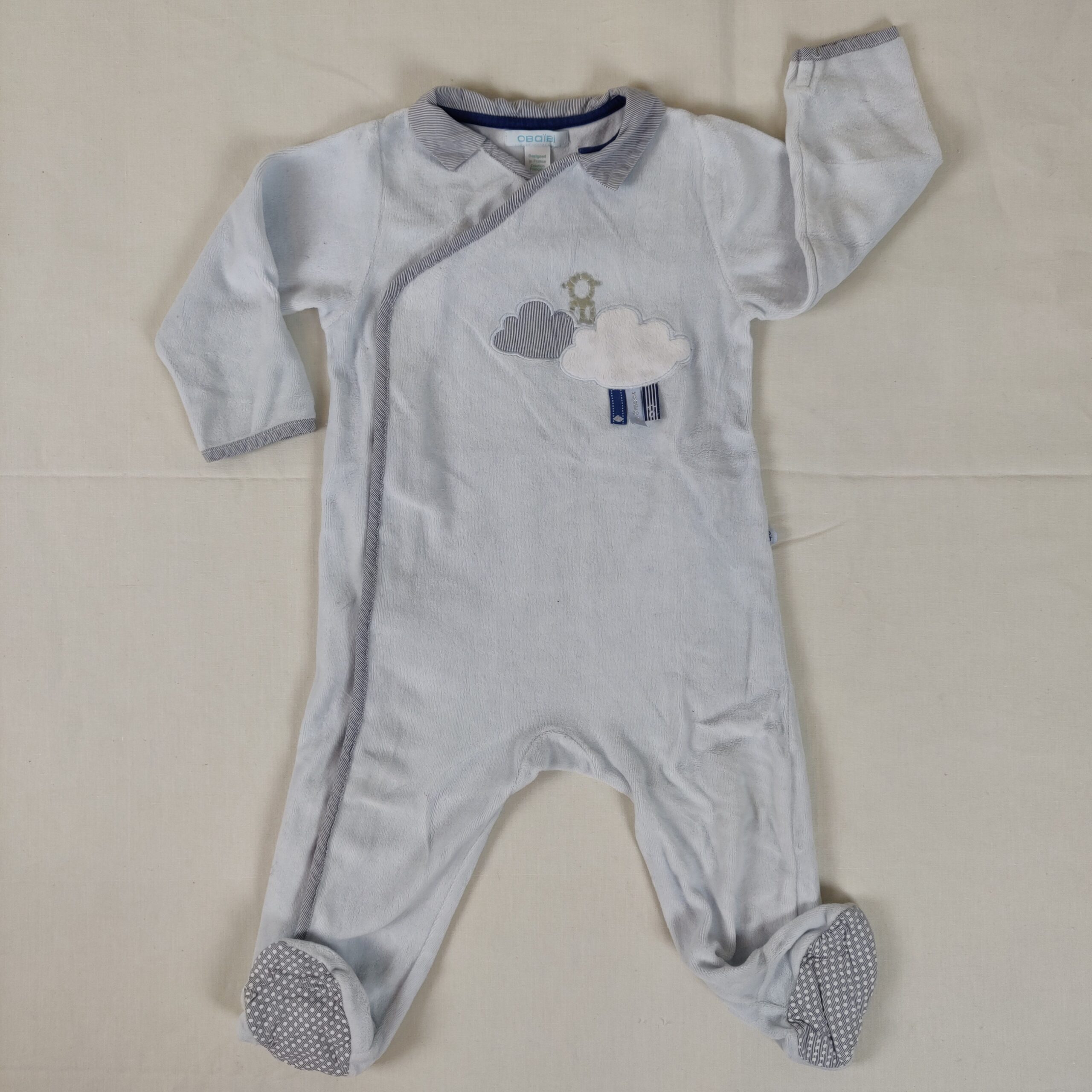 Autres commentaires : Pyjama dors bien en velours bleu pâle, avec ouverture devant par boutons pression, avec bordures et col fines rayures – dessous de pieds anti-dérapants – thème Free Dreams et motif nuages – 80% coton, 20% polyester.