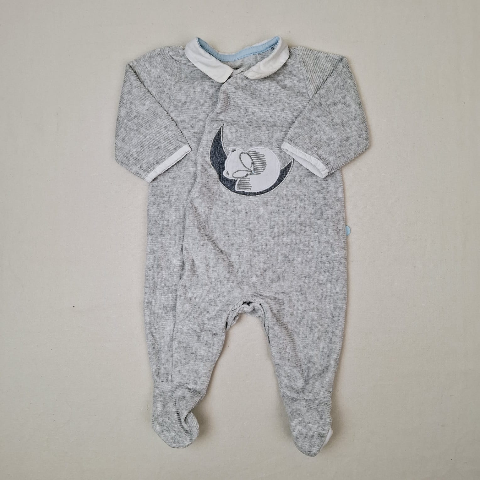 Autres commentaires : 45% polyester. Pyjama en velours côtelé gris, motif lune et renarde, fermeture par boutons pression devant et à l’entrejambe, col chemise.