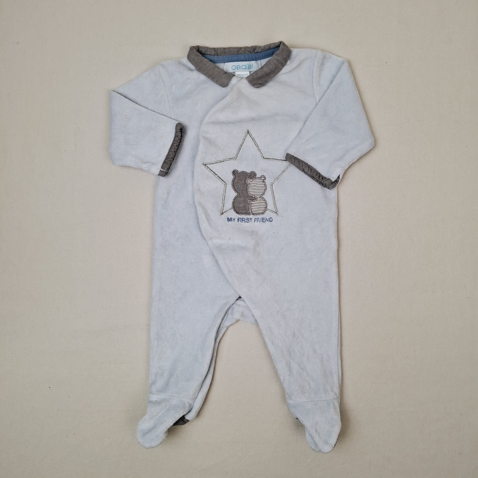Autres commentaires : 20% polyester. Pyjama dors-bien en velours bleu pâle avec col chemise gris et rappel du même tissu gris sous les pieds, fermeture devant et à l’entrejambe par boutons pression, devant motif central de 2 ours gris enlacés devant une étoile aux contours argentés avec l’inscription en bleu ‘My first friend ».
