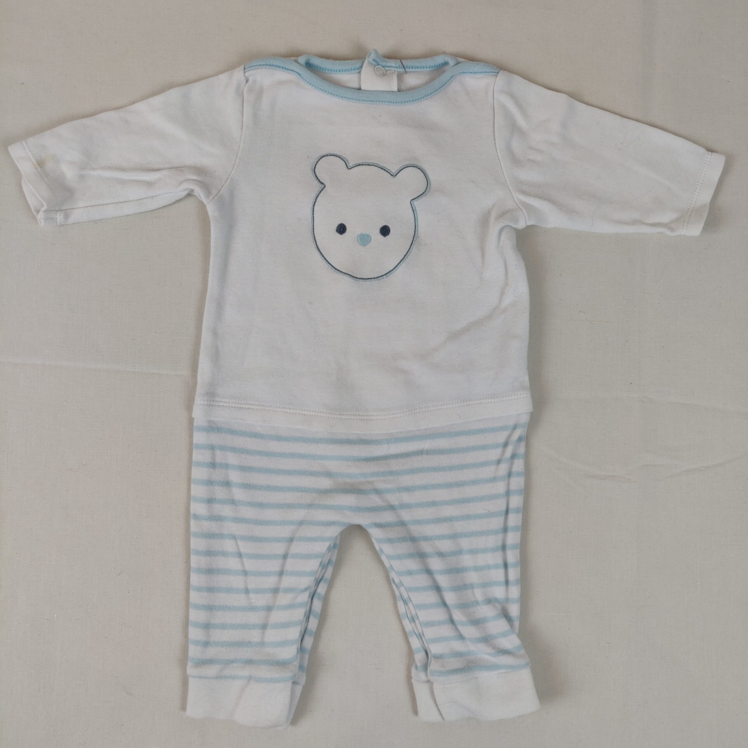 Autres commentaires : Pyjama à manches et sans pied en 2 parties : partie supérieure blanche avec motif central ourson et partie inférieure à partir de la taille blanche à rayures bleu clair. Ouverture à l’entre-jambe à boutons pression. Ouverture dans le dos à partir du col à 3 boutons pression. Effet légèrement pelucheux.