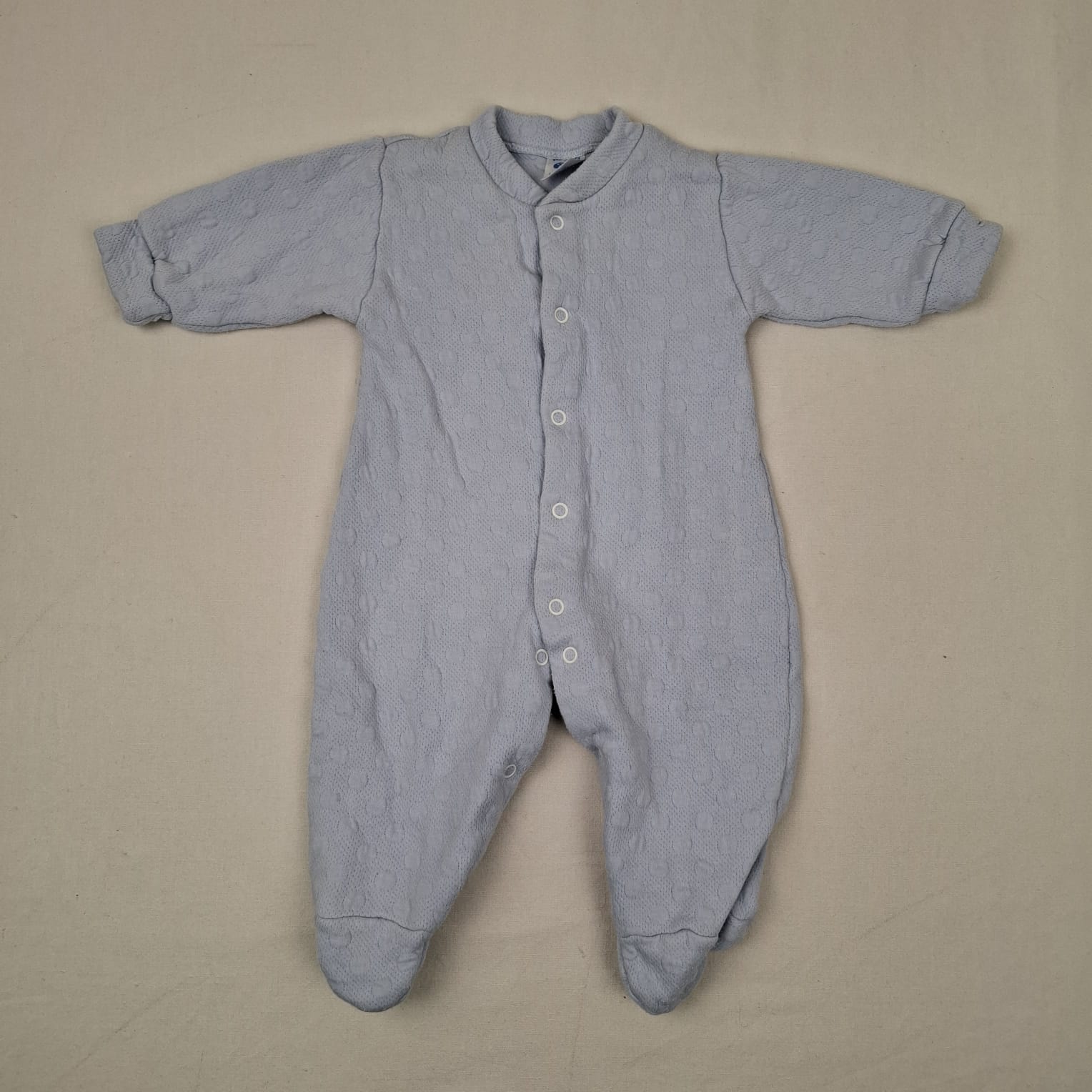 Autres commentaires : Pyjama dors-bien épais bleu clair, parsemé de ronds en relief, fermeture devant et à l’entrejambe par boutons pression.