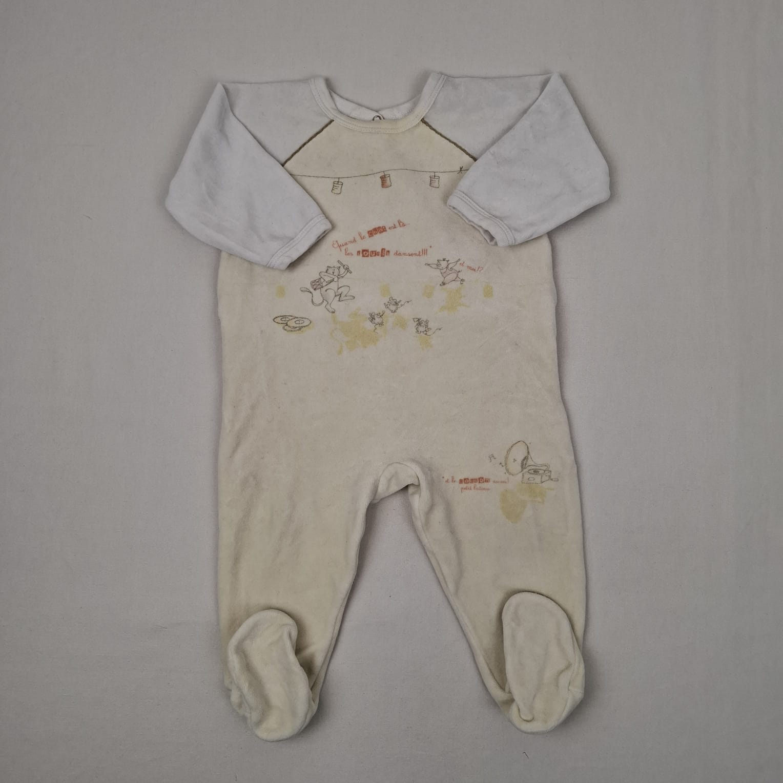 Autres commentaires : Pyjama une pièce jaune en velours, Petit Bateau, 12 mois, col rond, boutons pression à l’arriere pour la fermeture du vêtement, illustration d’animaux qui dancent et d’un tourne disque à l ‘avant du vêtement, col légèrement jaunis niveau réduit de fraise à myrtille, 25% polyesther.