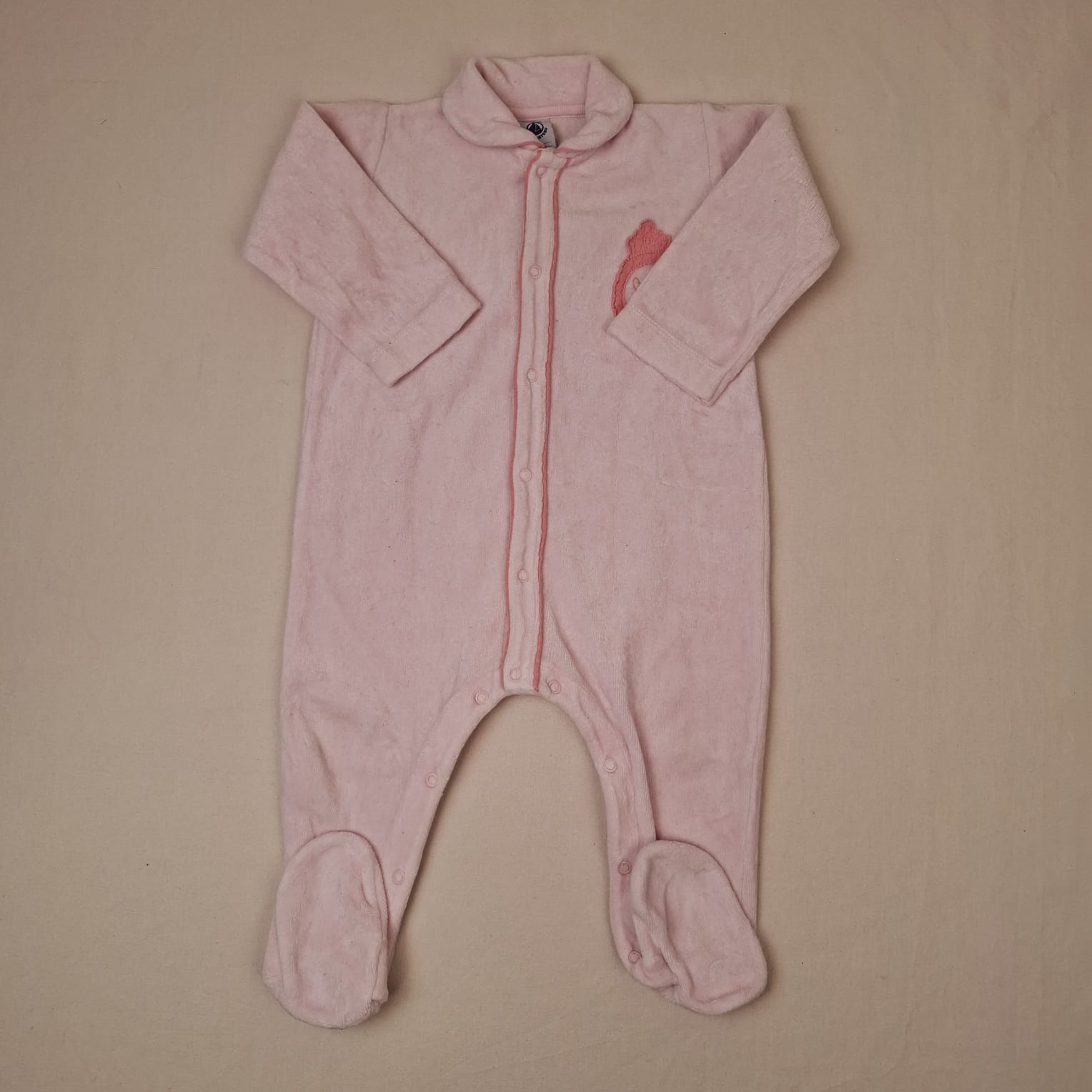 Autres commentaires : Pyjama uni en velours rose clair, motif lapin, col Claudine, fermeture par boutons pression devant et à l’entrejambe.