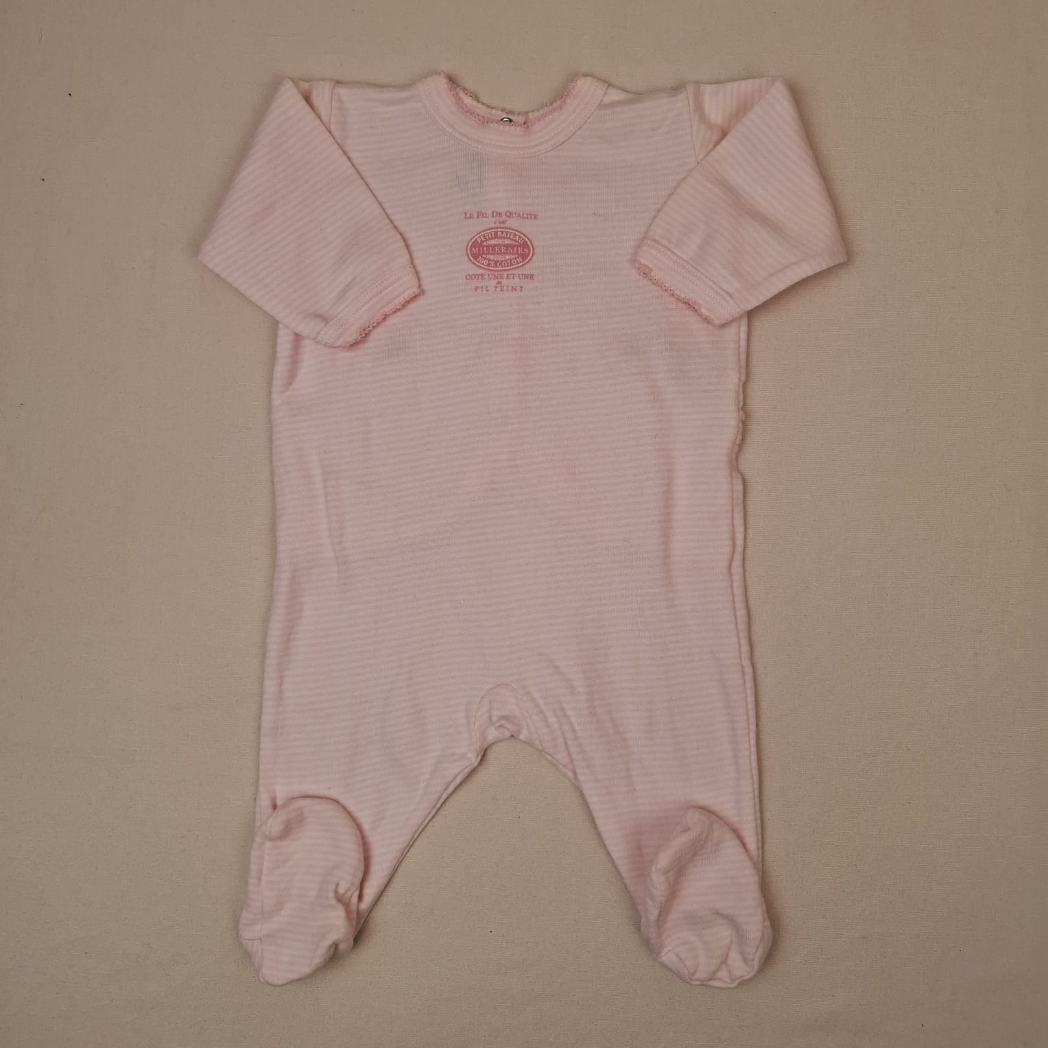 Autres commentaires : Pyjama à rayures blanches et roses, col rond, fermeture par boutons pression au dos, inscription « Petit bateau MILLERAIES » devant.