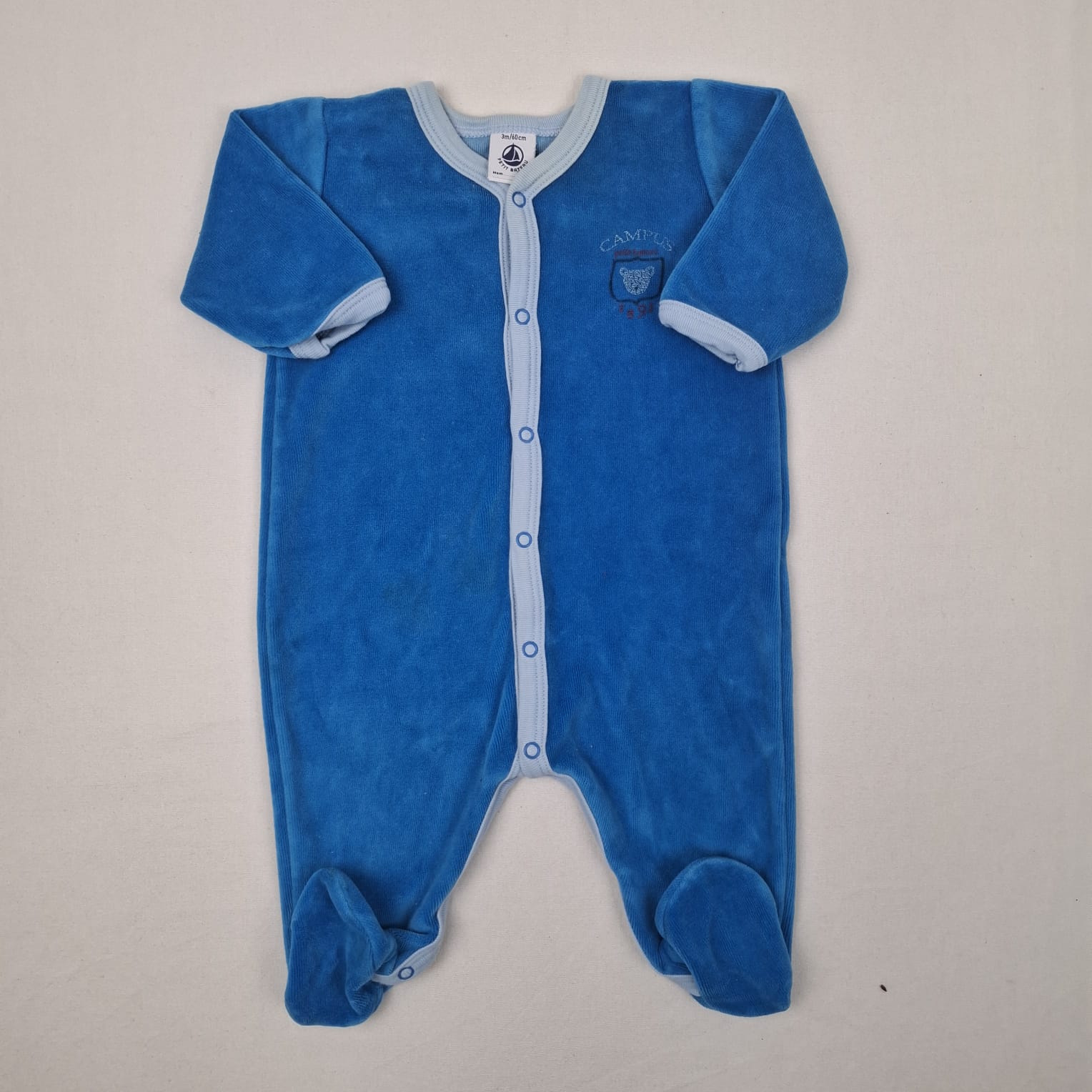 Autres commentaires : Pyjama une pièce bleu , Petit bateau, 3 mois, ouverture à l’avant boutons pression, petit logo d’un campus