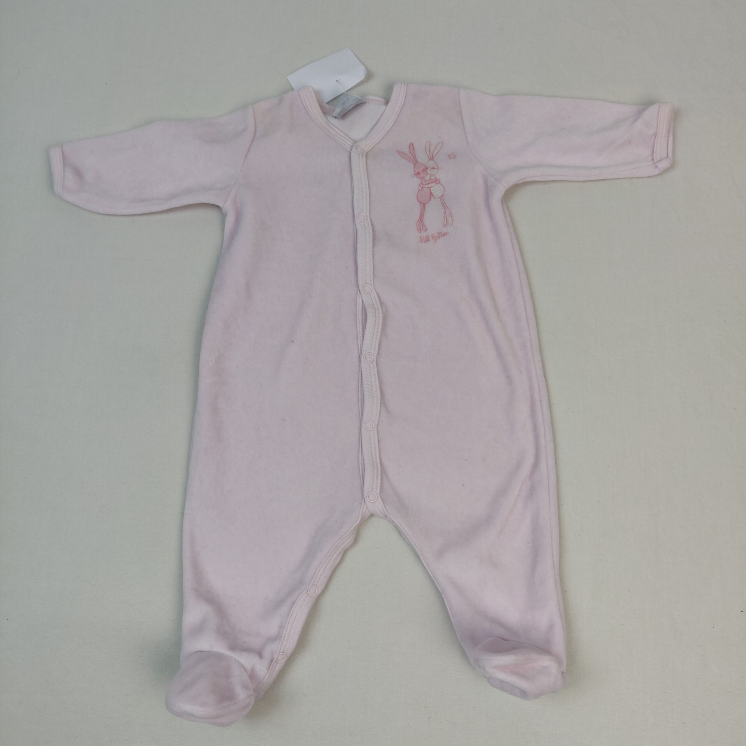 Autres commentaires : Pyjama dors-bien en velours rose layette, avec pieds, col légèrement en V, motif « lapins » en ton sur ton, fermeture par boutons pression à l’avant et à l’entrejambe.
