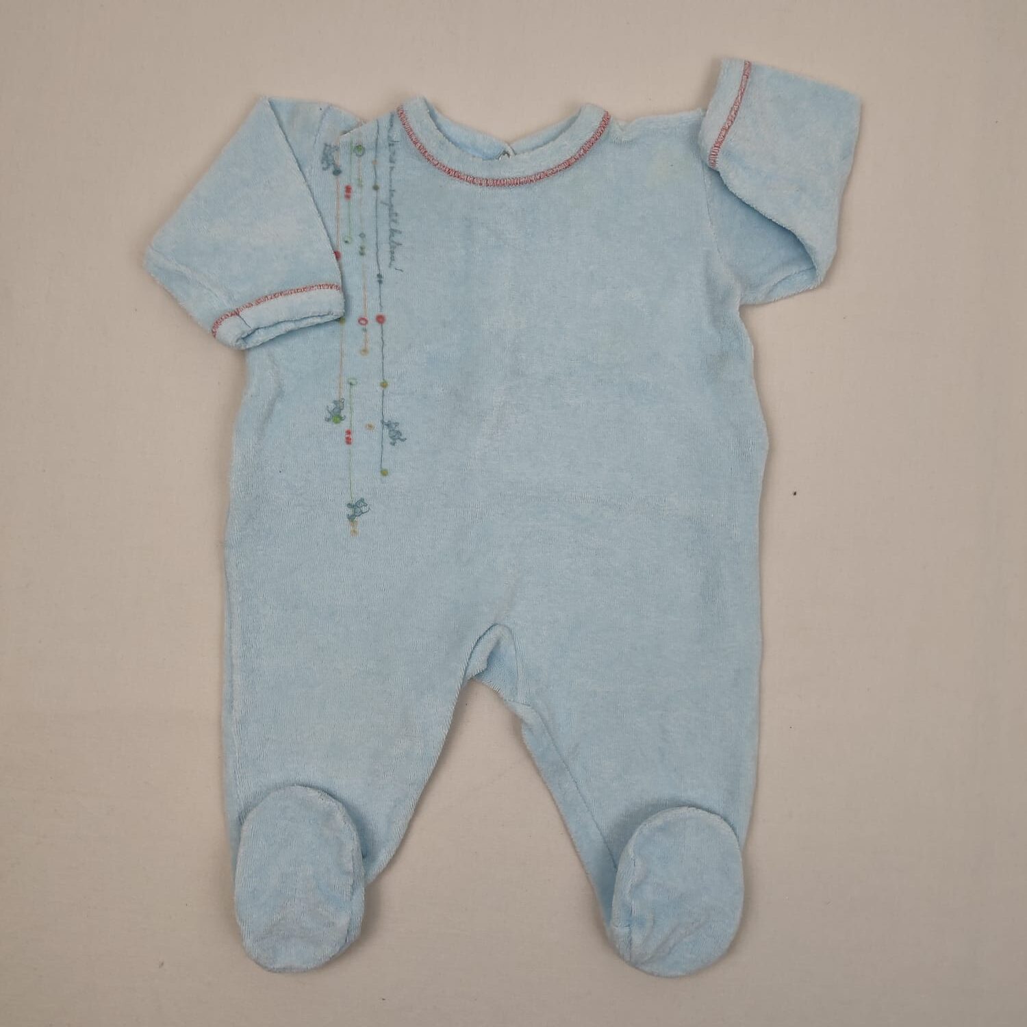 Autres commentaires : 15% polyamide – Pyjama dors-bien en velours-éponge bleu clair avec pieds, fermeture par boutons pression à l’arrière.