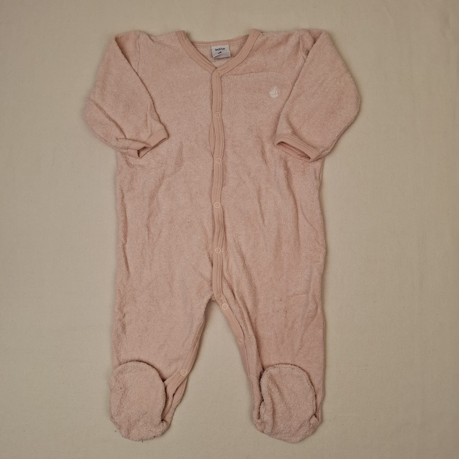 Autres commentaires : Pyjama dors-bien en éponge couleur pêche très clair, fermeture devant et à l’entrejambe par petits boutons pression,