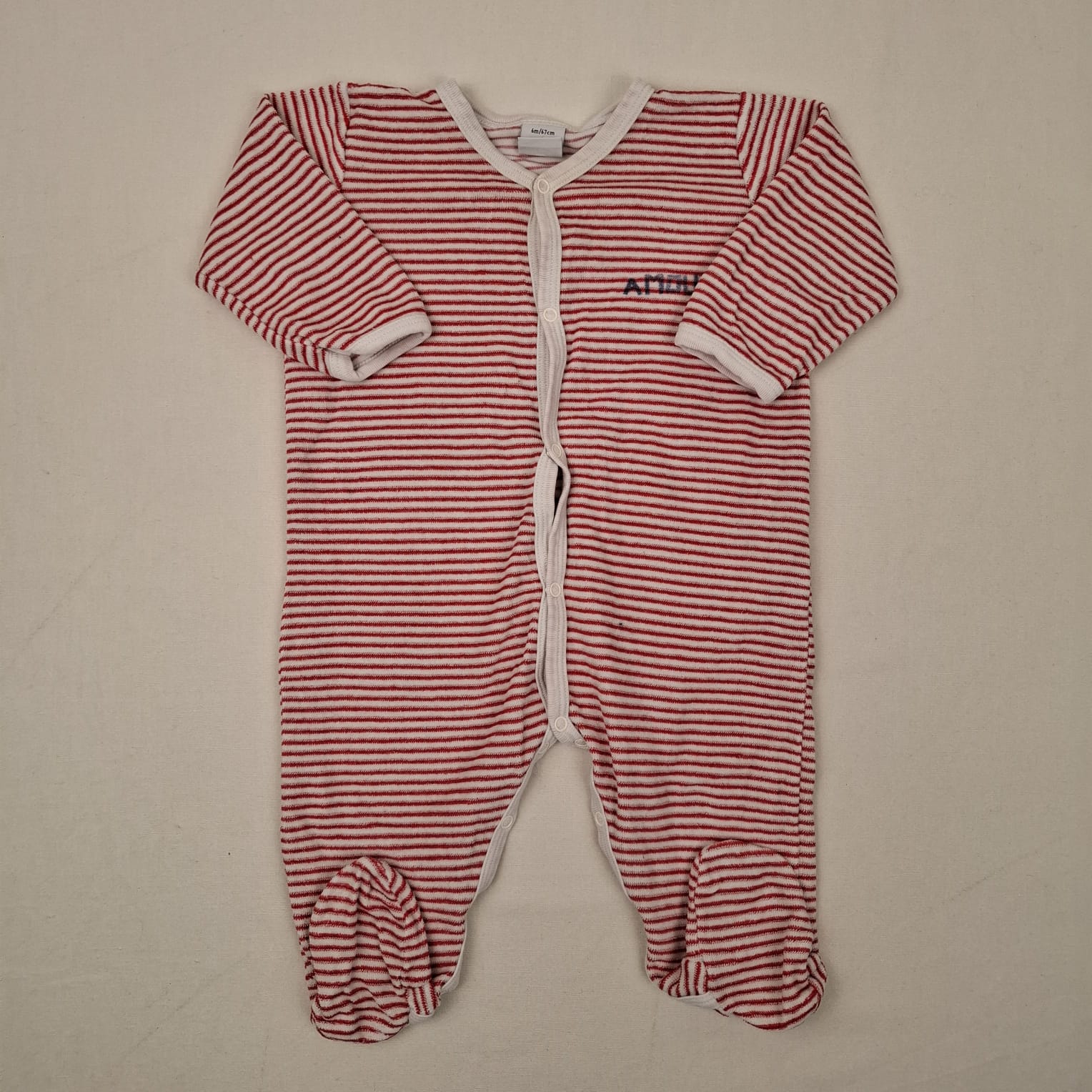 Autres commentaires : Pyjama en velours blanc à rayures rouges, col V, fermeture par boutons pression devant et à l’entrejambes, inscription « Amour ».