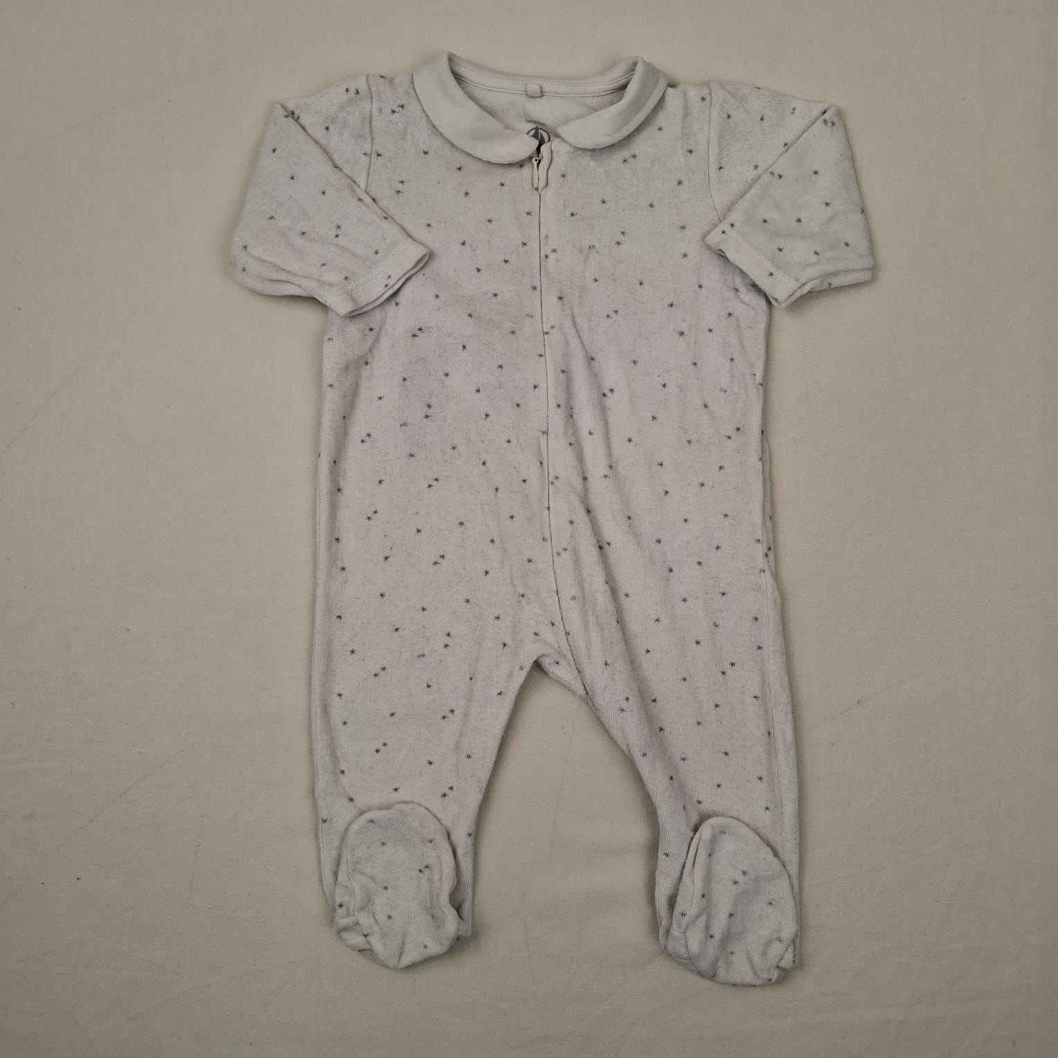 Autres commentaires : Pyjama en velours blanc à pois grises, col Claudine, fermeture en zip avec protège-zip pour leur petit cou.