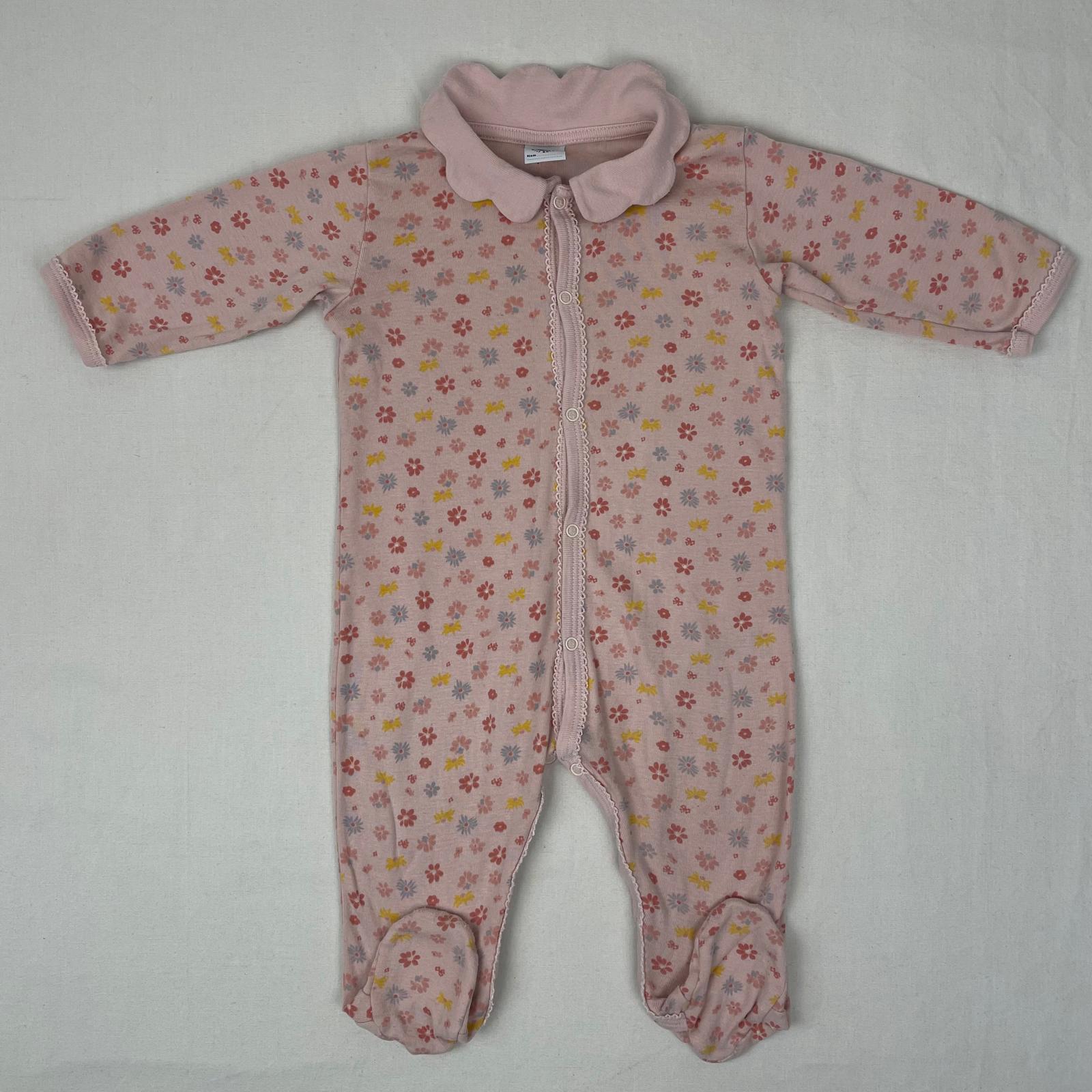 Autres commentaires : Pyjama 1 pièce avec pieds, devant et entre les jambes fermeture par boutons pression, col collerette, motifs parsemé .des fleures en rose foncé et jaune.