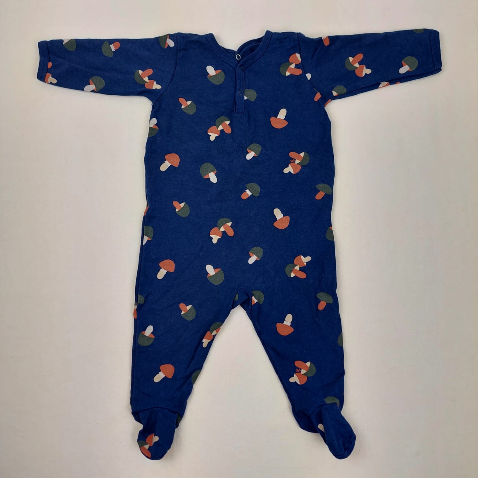 Autres commentaires : Pyjama dors bien bleu marine, motifs champignon, pressionné au dos avec pieds