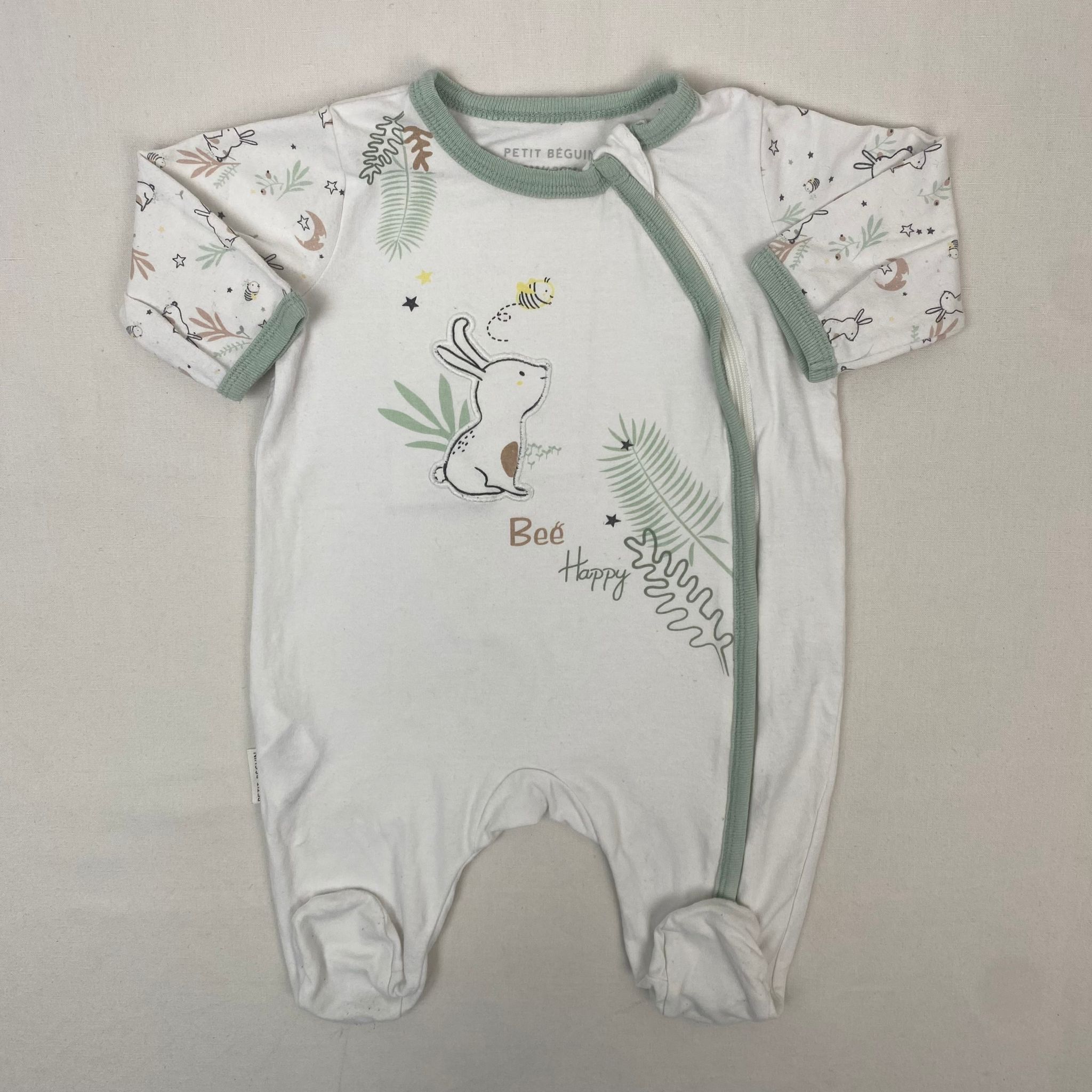 Autres commentaires : 5% élasthanne. Pyjama blanc écru avec le col et le bord des manches en vert et des motifs de lapins, fermeture devant latérale par zip.