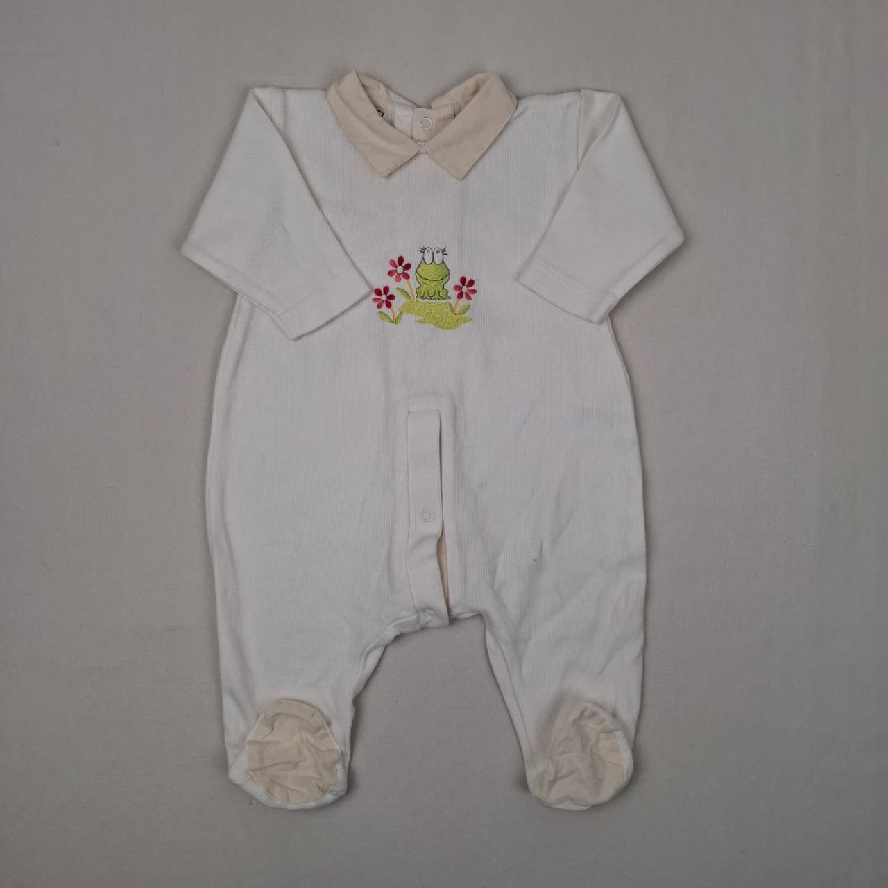 Autres commentaires : Pyjama blanc Vintage, Petit Descamps, taille estimé a 6 mois, petite grenouille brodé à l’avant du pyjam, col chemise, boutons à pression pour l’ouverture à l’arrière.