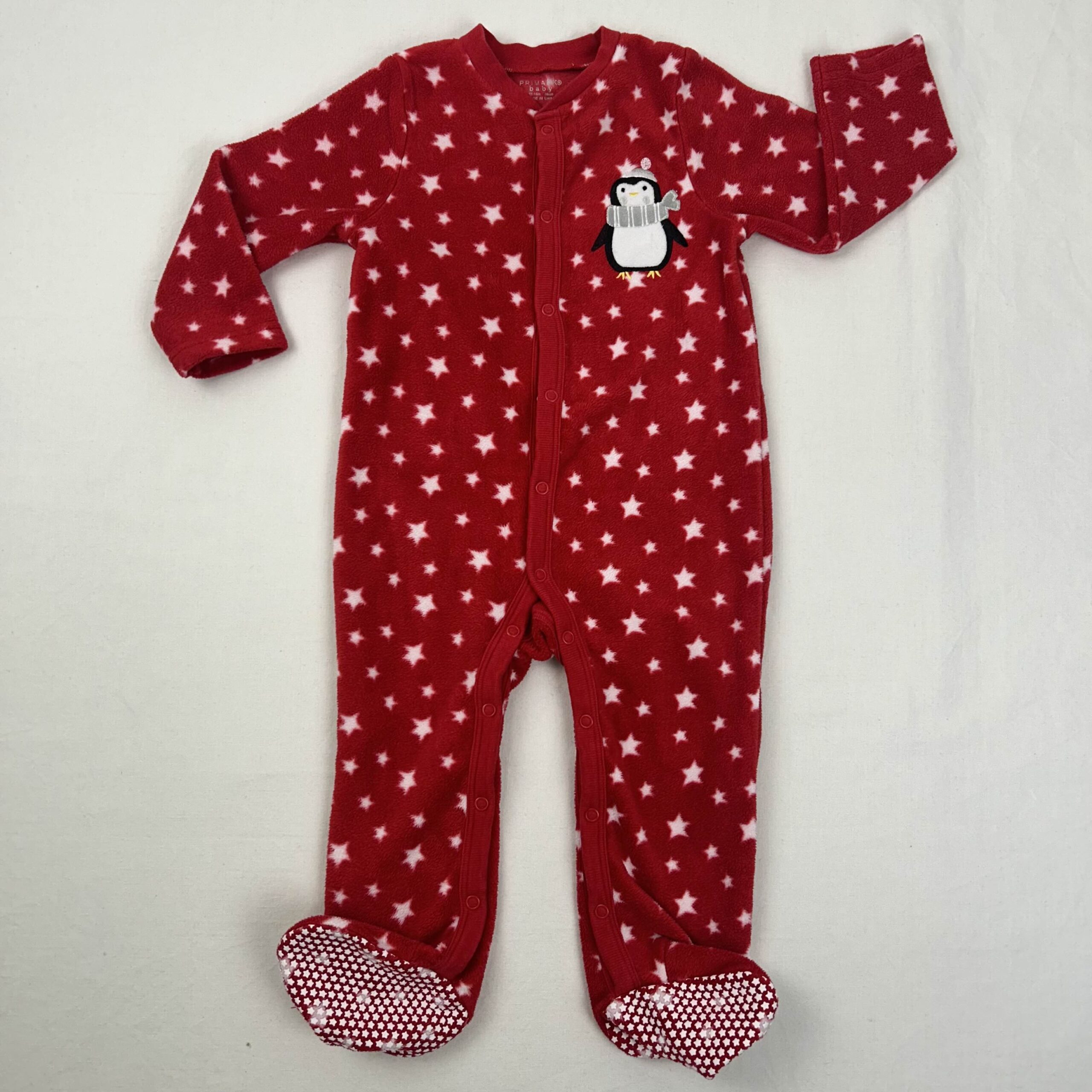 Autres commentaires : Pyjama dors-bien en polaire rouge de Noël, parsemé de petites étoiles blanches, motif pinguoin sur le devant, et motif étoile blanche en bas du dos, fermeture par boutons sur le devant et à l’entrejambe.