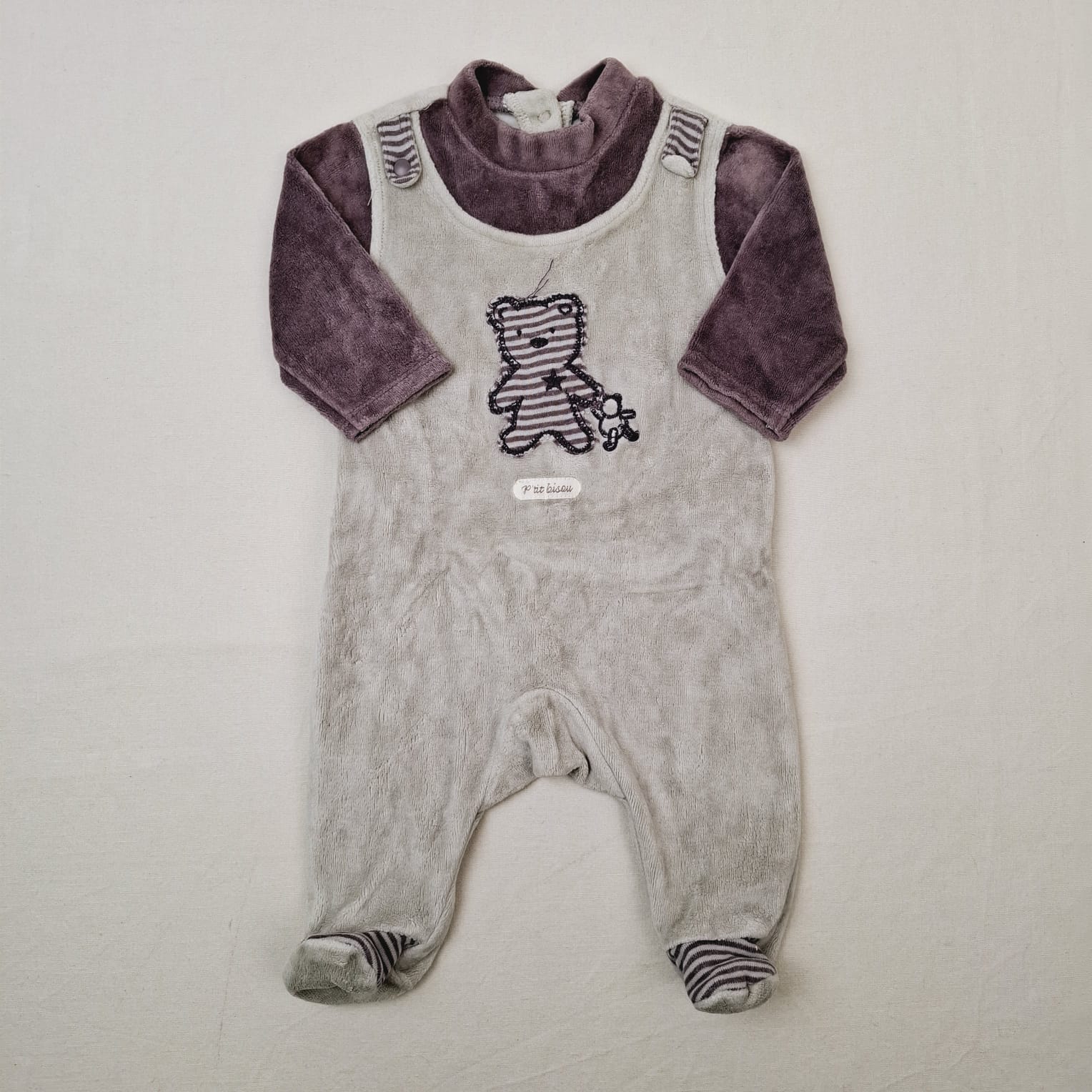 Autres commentaires : 20% polyester. Pyjama dors-bien en velours gris clair et violet, effet salopette,devant motif ours en peluche rayé violet, col cheminée, fermeture au dos par boutons pression.