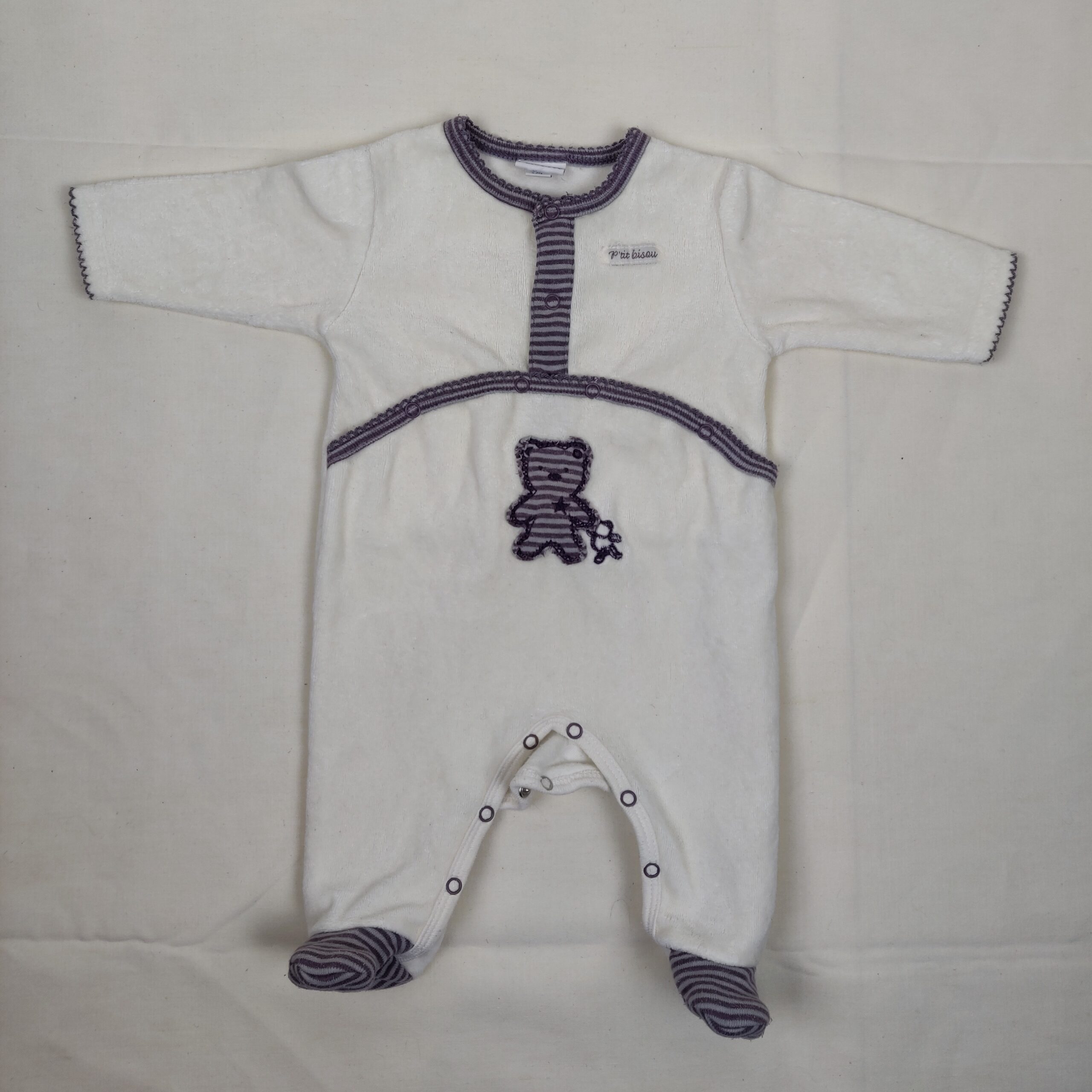Autres commentaires : 20% polyester. Pyjama dors bien écru en velours, fermé à la taille et à l’entrejambe par boutons pression. Petit ours brun rayé brodé au niveau du ventre.