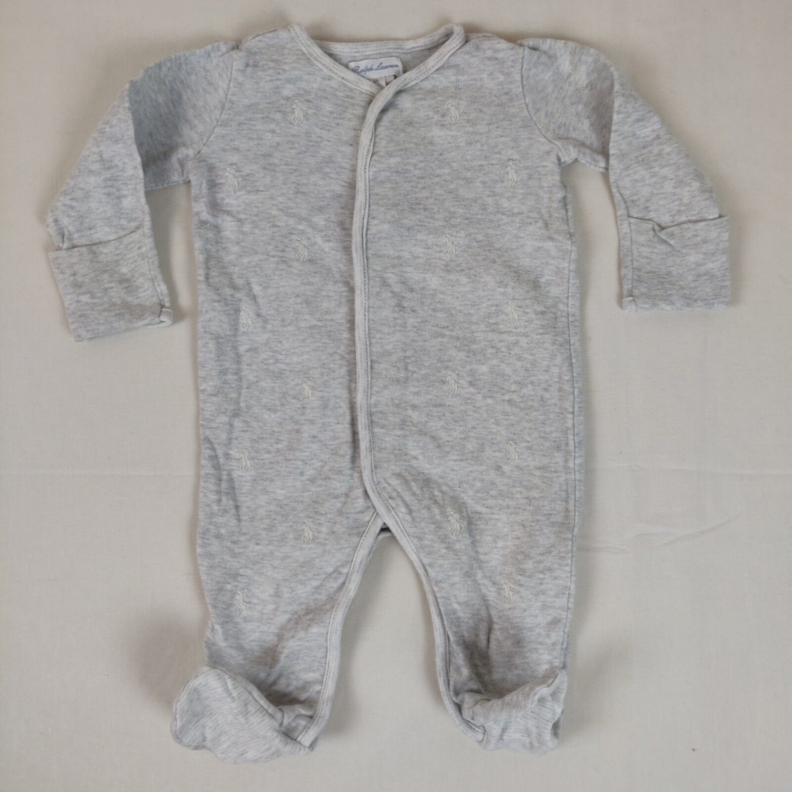 Autres commentaires : Pyjama 1 pièce DORS-BIEN à manches longues et à pieds – gris chiné avec motifs blancs brodés jockey de la marque. Ouverture pressionnée au dos. Poche en bordure des manches.