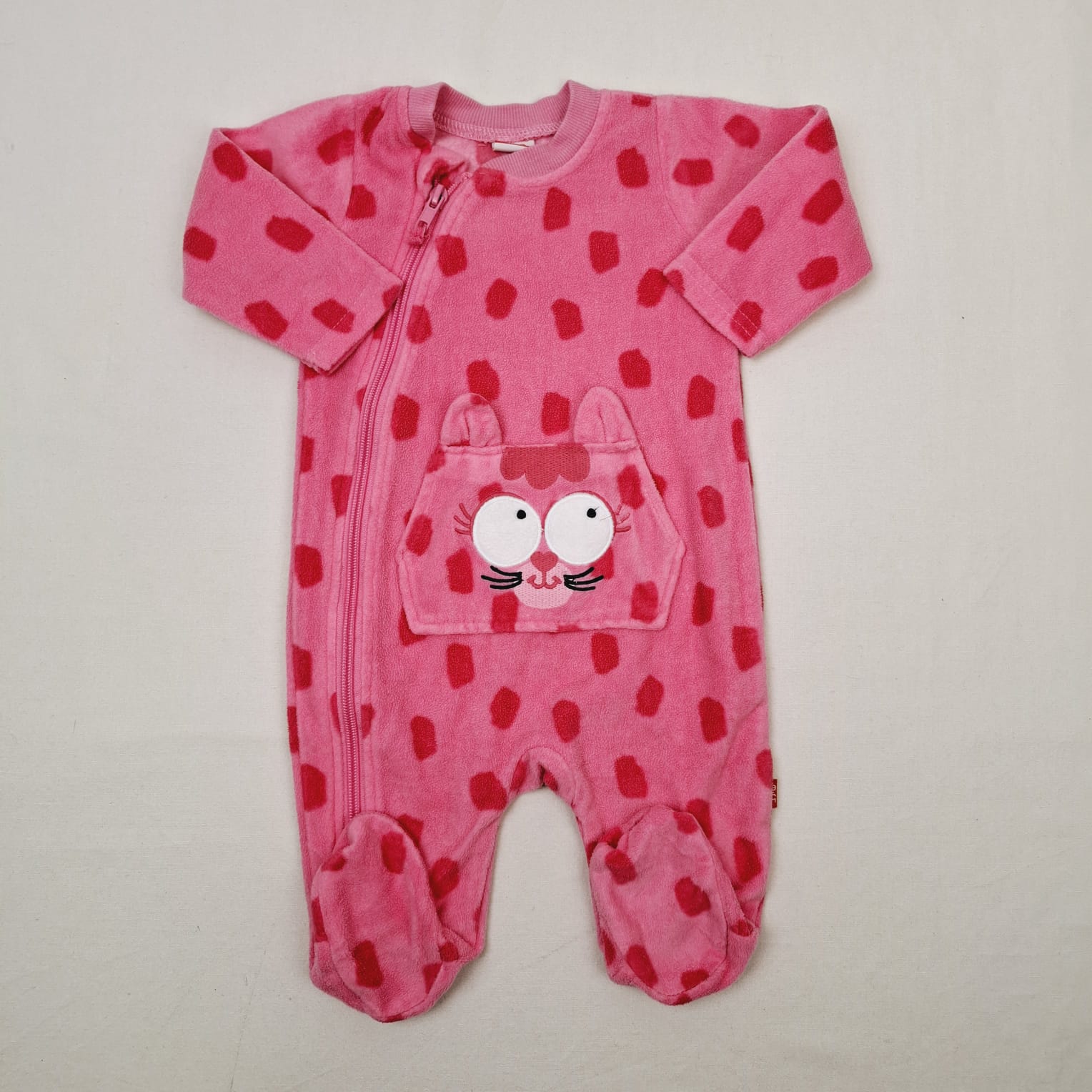 Autres commentaires : Pyjama polaire rose à pois rose foncé, fermeture par zip l’avant, motif chat sur la poche centrale.