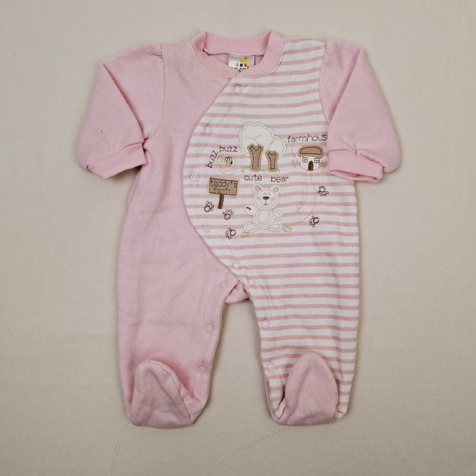 Autres commentaires : 35% polyester. Pyjama rose en molleton, motif ours et inscription « Buzz, farmhouse », fermeture par boutons pression devant et à l’entre jambes.