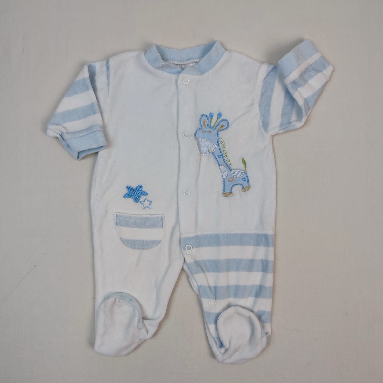 Autres commentaires : 20% Polyester – Pyjama dors-bien avec pieds en velours blanc, rayé bleu clair au niveau des manches, des jambes et de la posche devant, motif girafe bleu clair, fermeture par boutons pression à l’avant.