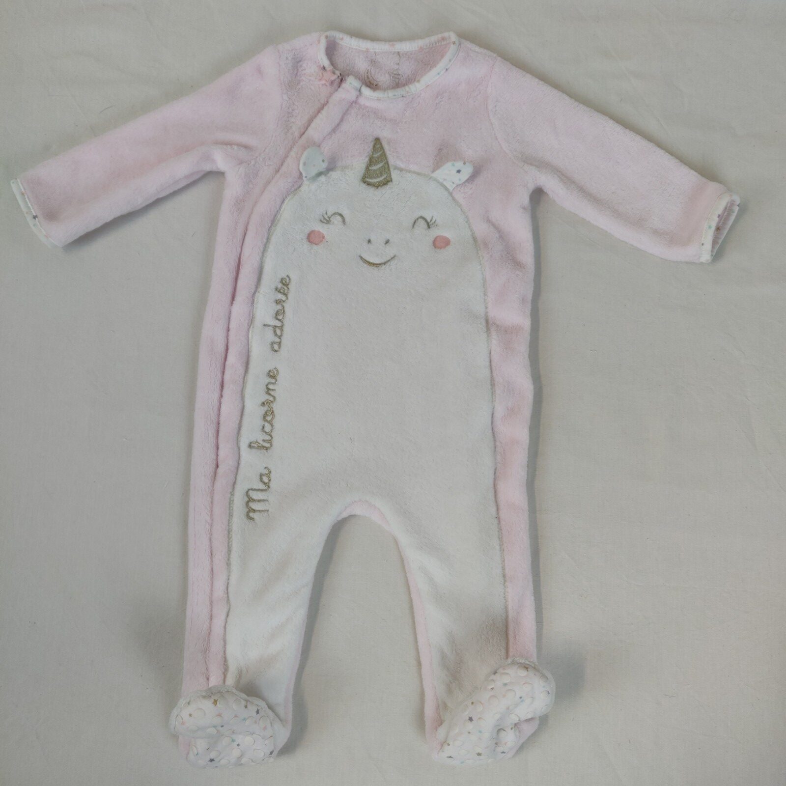 Autres commentaires : Pyjama 1 pièce à manches longues et à pieds – rose avec motif central piqué licorne blanche accompagné de l’inscription dorée « Ma licorne adorée ». Motifs piqués au dos ailes de la licorne. Ouverture latérale zippée. Semelles antidérapantes. Usure normale du vêtement.